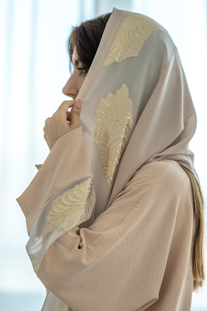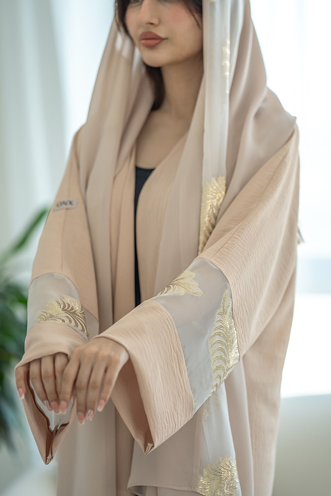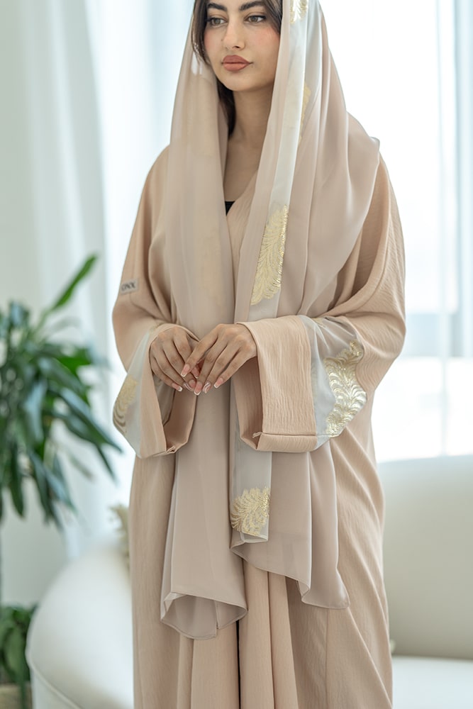 عبايه كريب بيج فاتح (كريمي) مع شيفون بنقشه ذهبيه