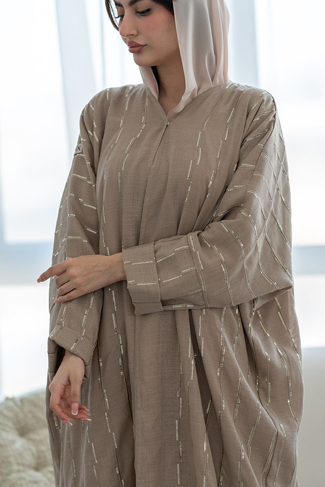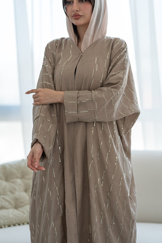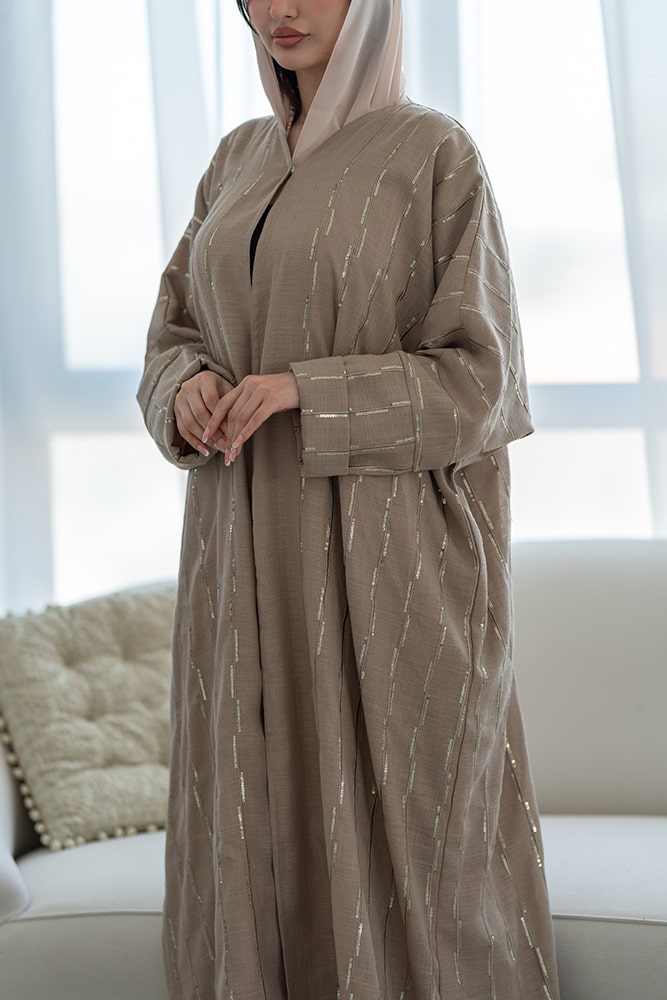 عباية بقماش لينين مبطن باللون البيج الداكن بتشكيله ذهبية
