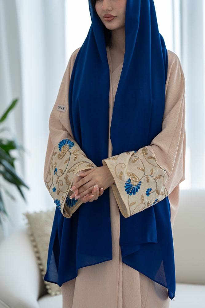 عباية بقماش كريب باللون الكريمي مع تركيبه باللون الذهبي والأزرق في الأكمام