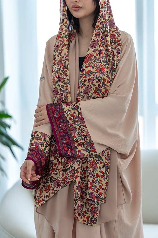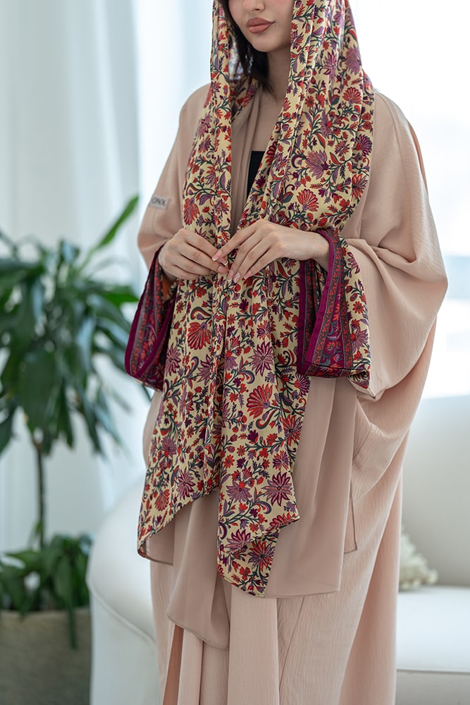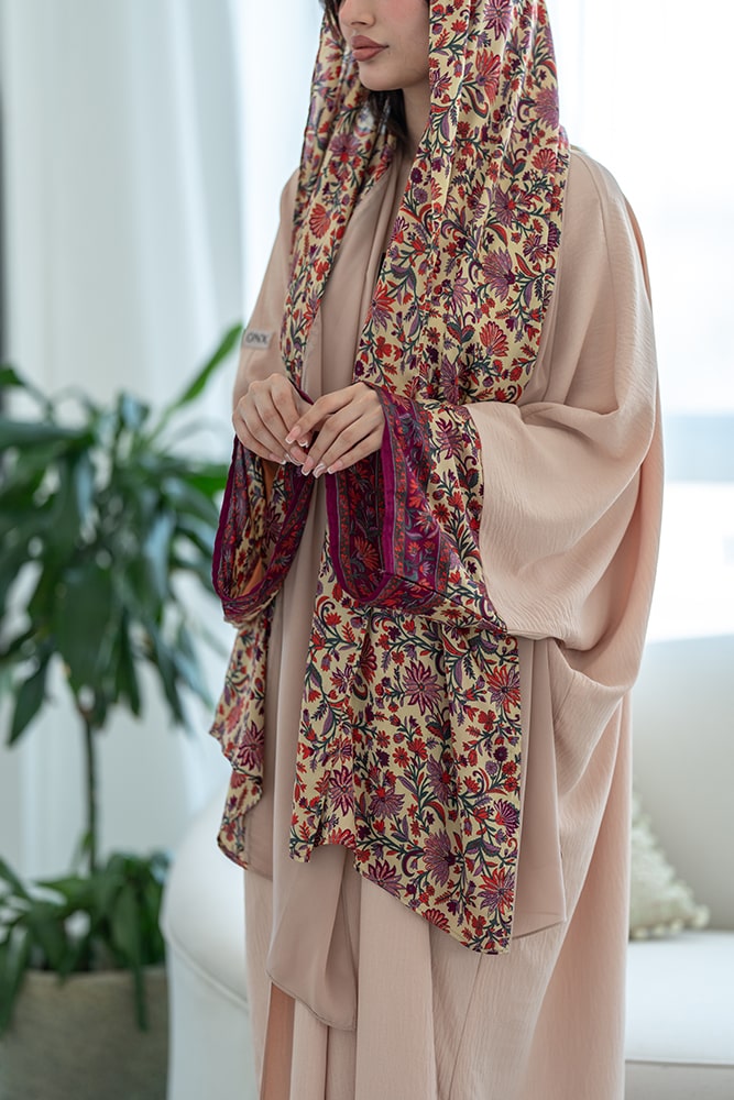 عبايه كريب بيج فاتح (كريمي) مع تركيبه حرير في الاكمام و الطرحه