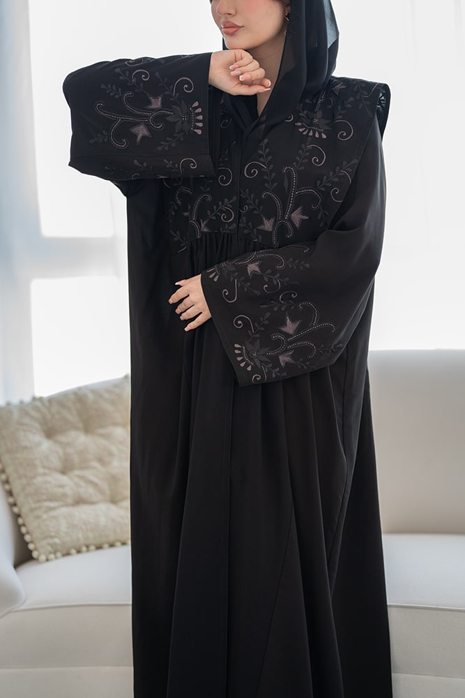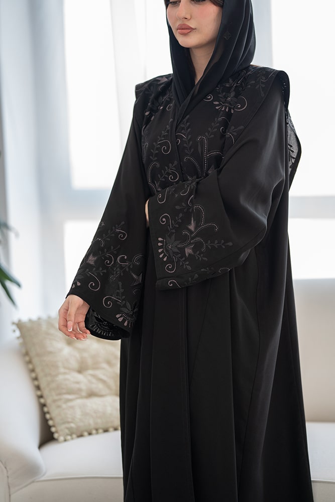 عباية بقماش كريب أسود مع تطريز