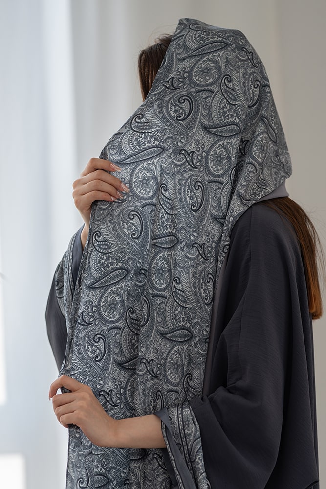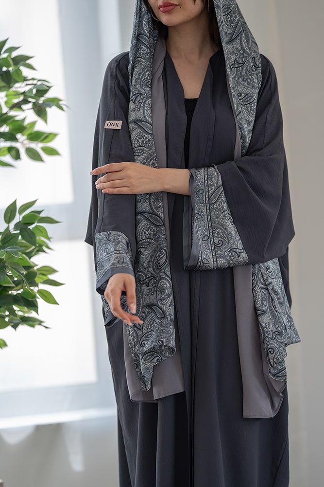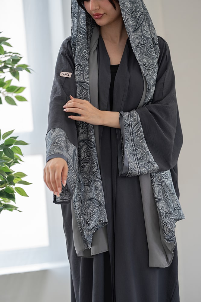 عباية كريب باللون الرصاصي مع تركيبه حرير في الاكمام و الطرحه