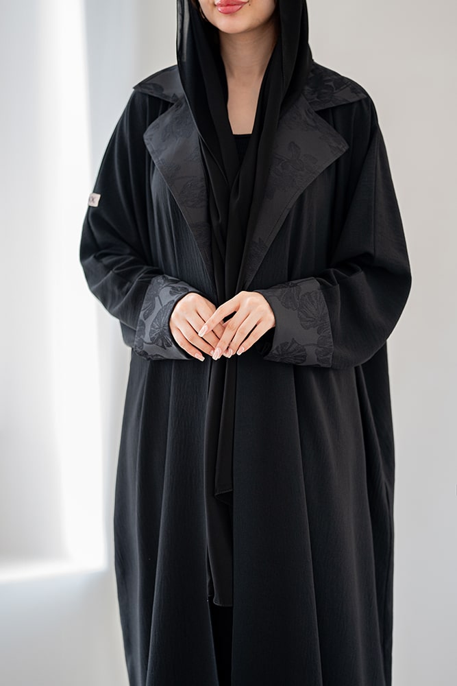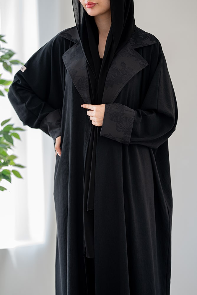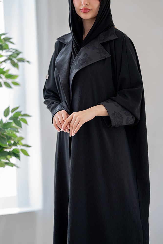 عباية بقماش كريب أسود مع تشكيلة في الياقة و الأكمام