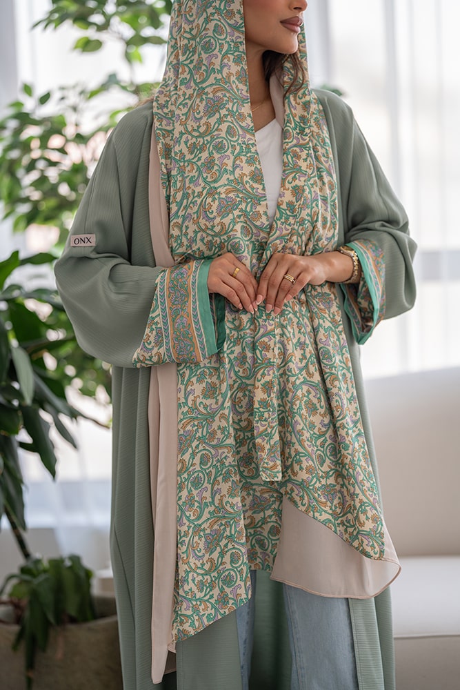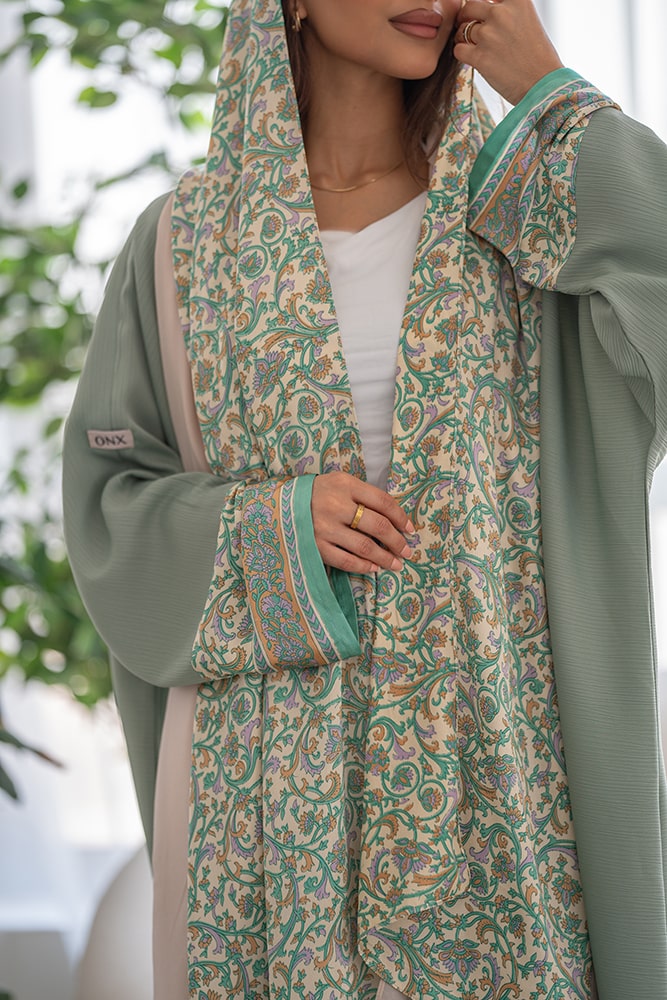 عباية كريب باللون الأخضر الفاتح مع تركيبه حرير في الاكمام و الطرحه