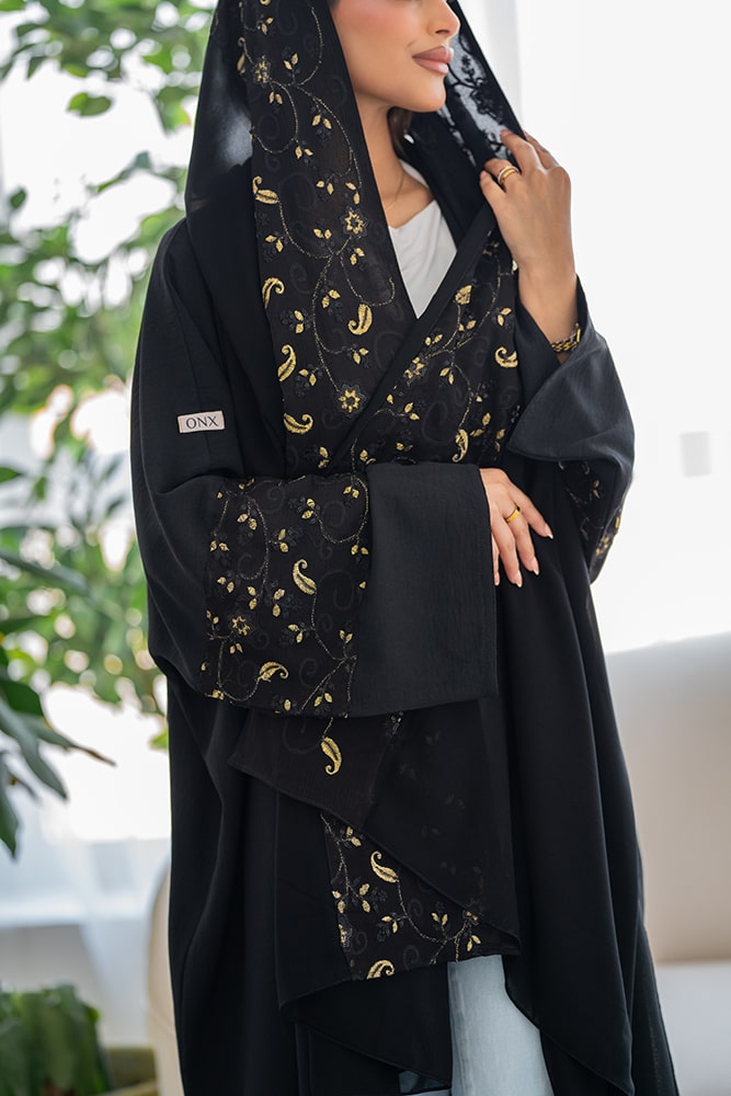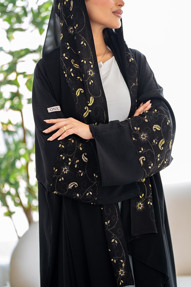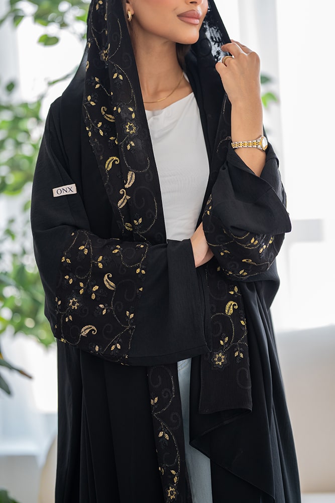 عباية بقماش كريب أسود مع تركيبة و طرحة باللون الذهبي والأسود