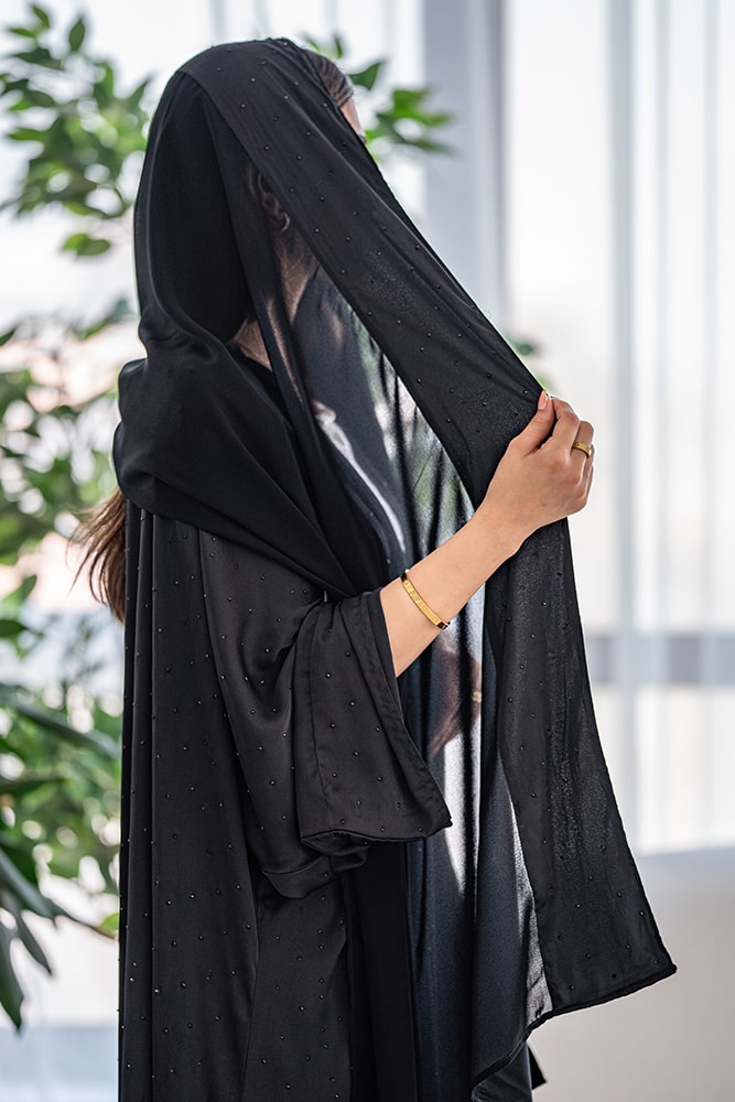 عباية بقماش كريب أسود مع فصوص في العباية و الطرحه