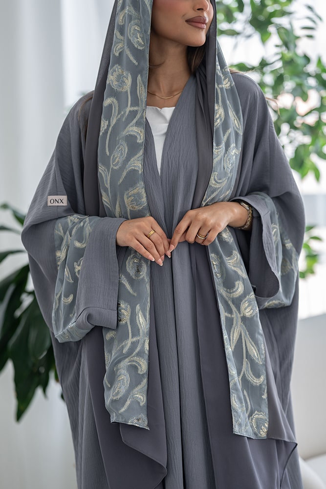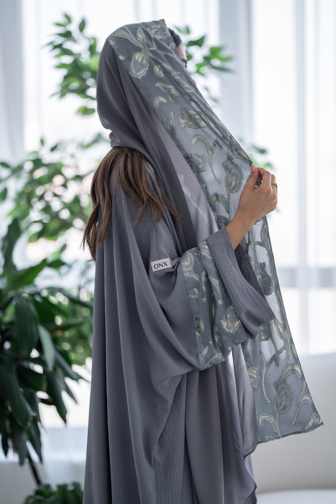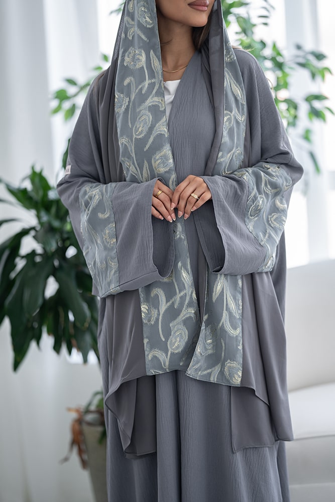 عباية بقماش كريب باللون الرصاصي مع تركيبة في الأكمام و الطرحه