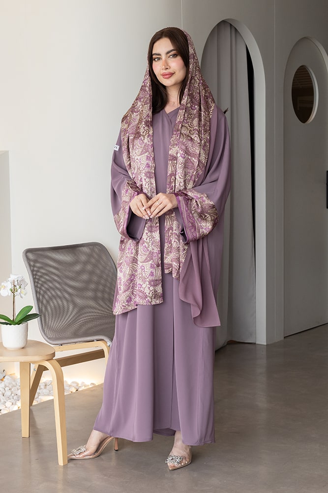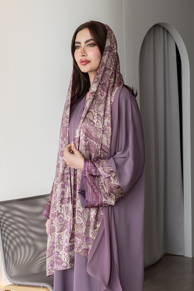 عباية بقماش كريب باللون البنفسجي مع تركيبة في الأكمام و الطرحه