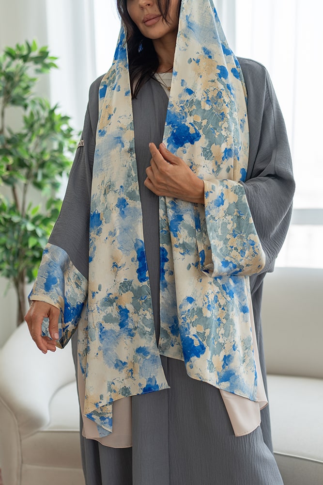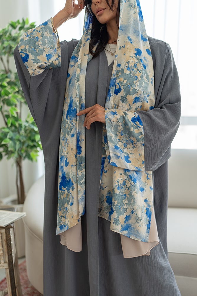 عباية بقماش كريب باللون الرصاصي مع تركيبة في الأكمام و الطرحه