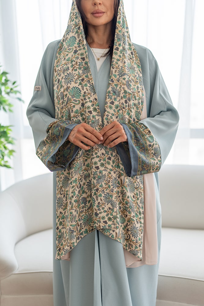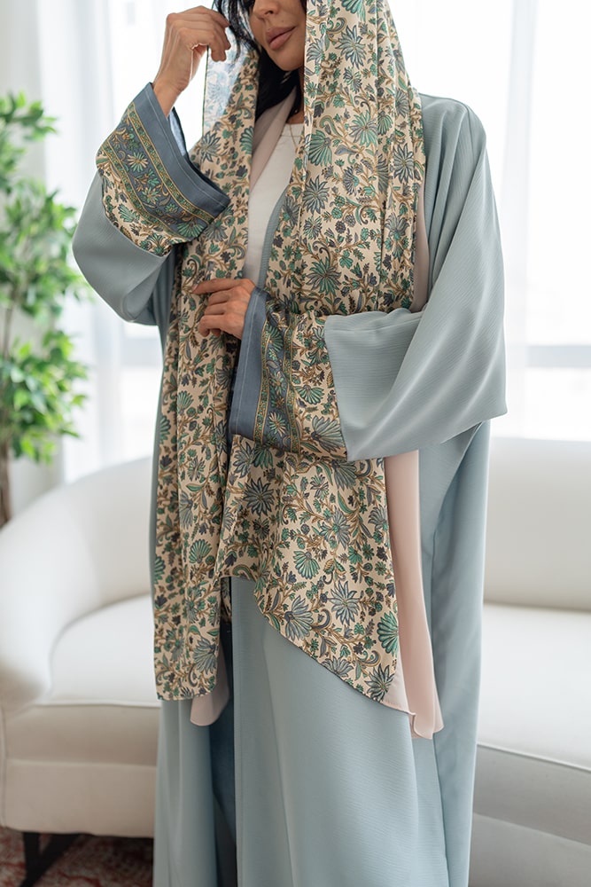 عباية كريب باللون الأزرق الفاتح مع تركيبه حرير في الاكمام و الطرحه