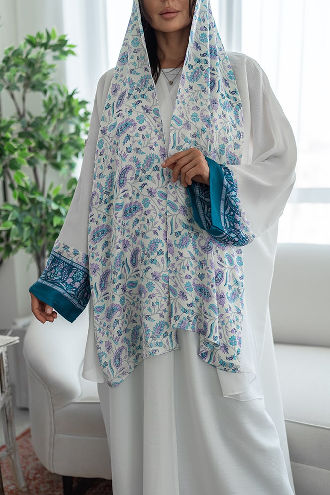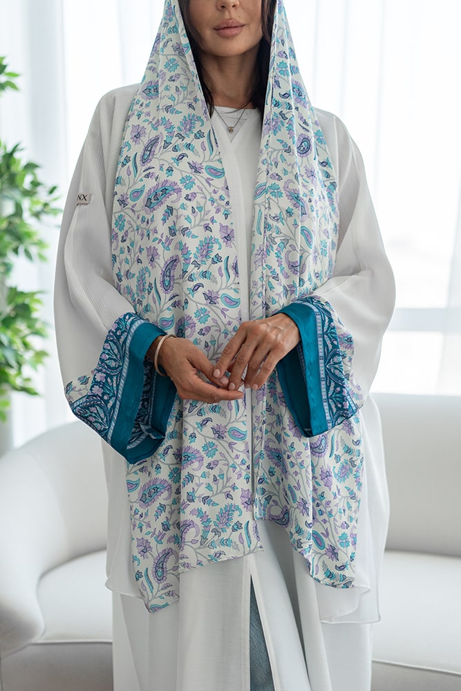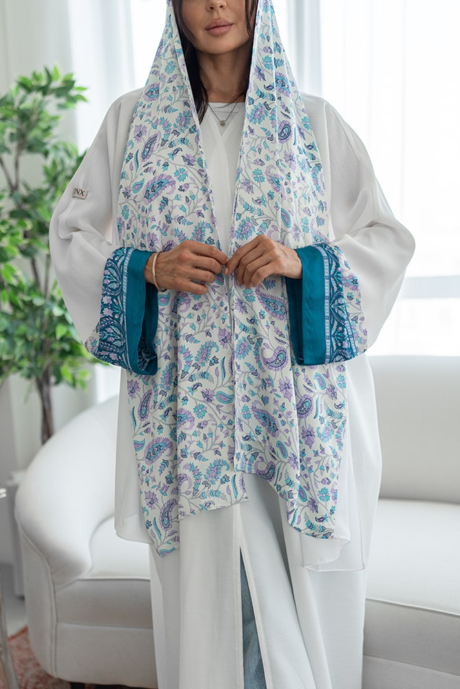 عباية كريب باللون الأبيض مع تركيبه حرير في الاكمام و الطرحه