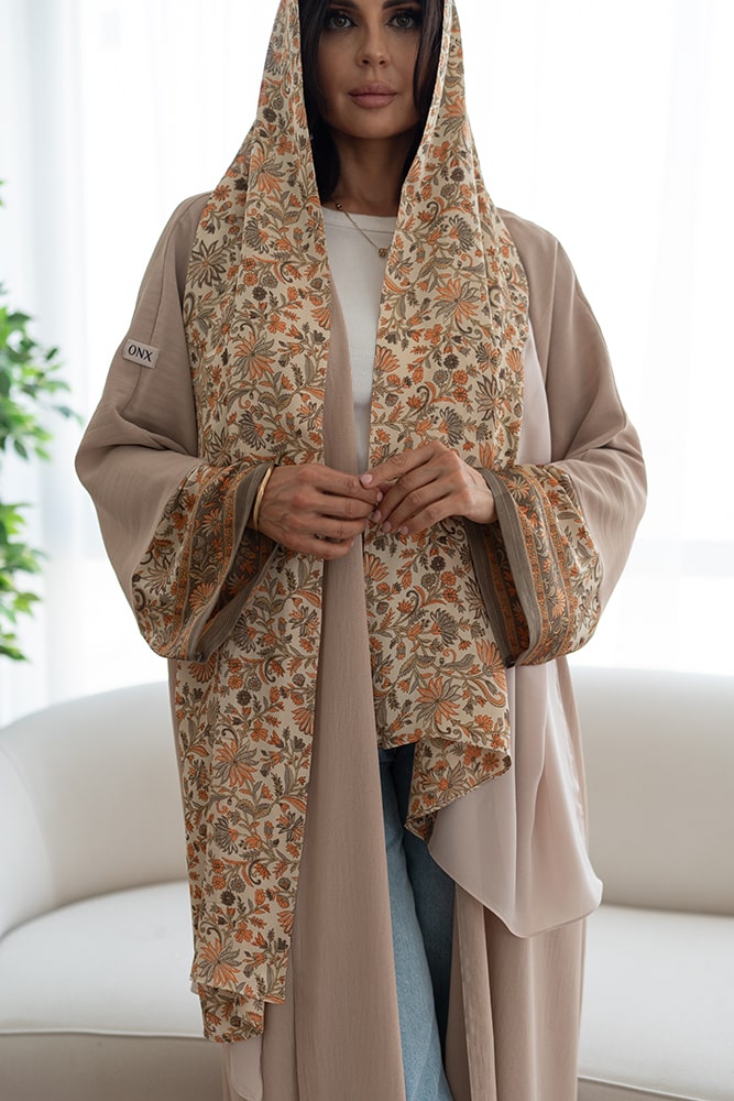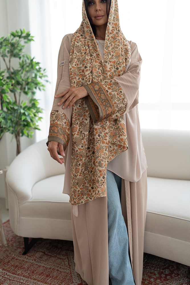 عباية بقماش كريب بيج مع تركيبة حرير في الأكمام و الطرحه
