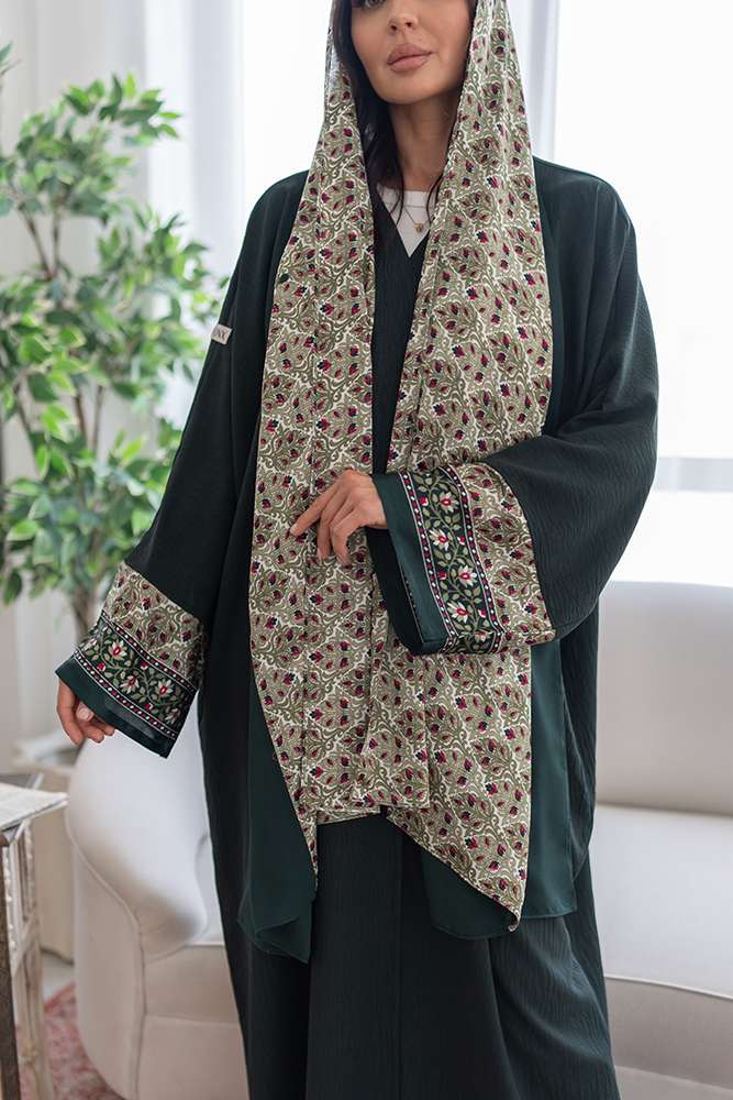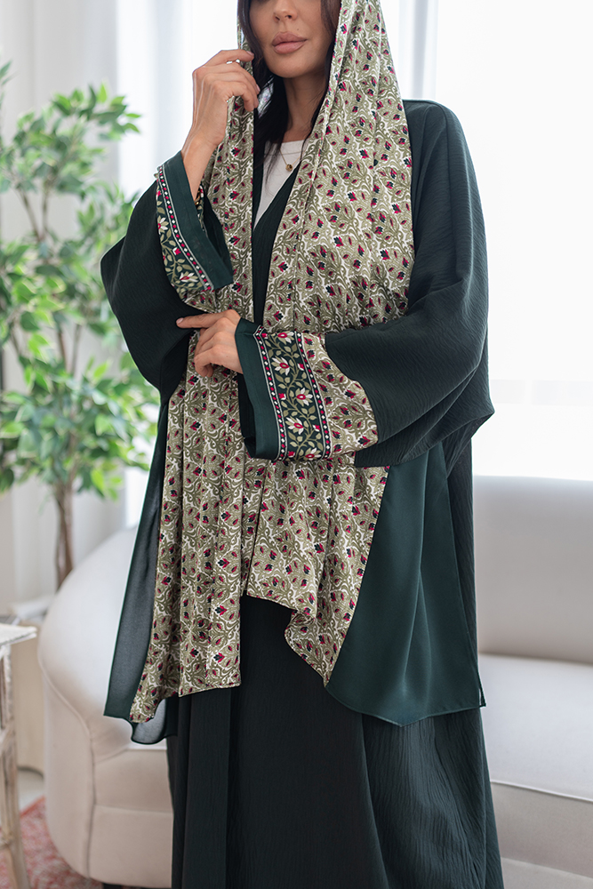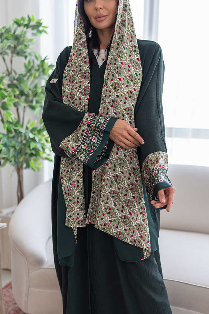 عباية بقماش كريب باللون الزيتي مع تركيبة حرير في الأكمام و الطرحه