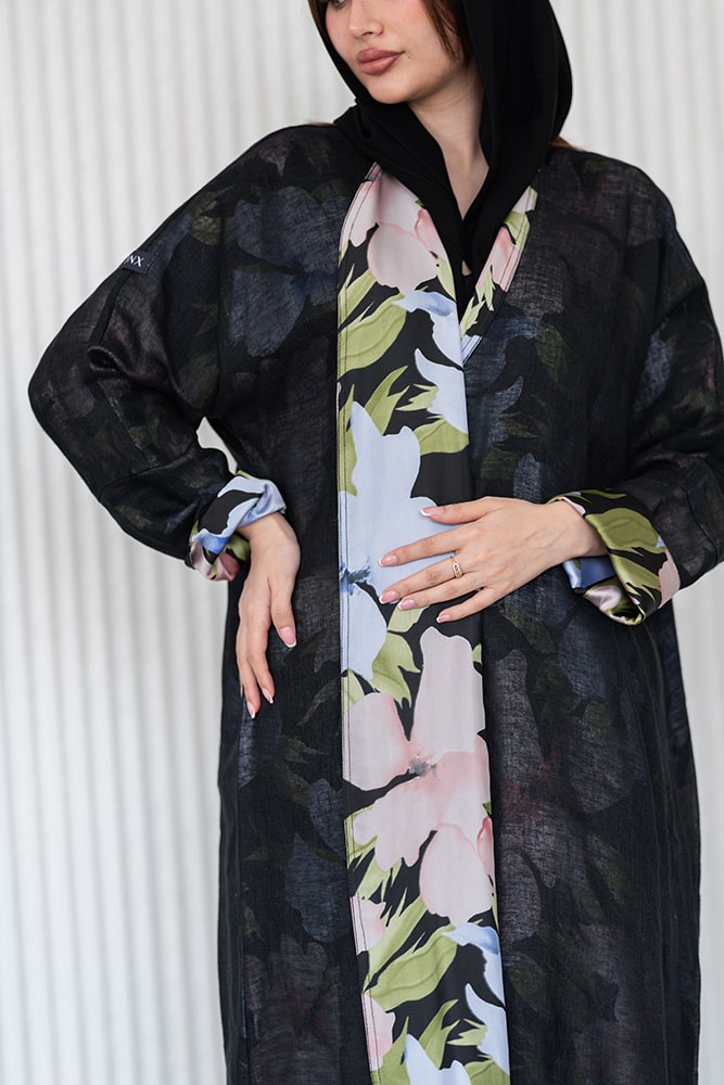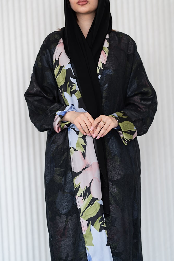 عباية بقماش لينين أسود مبطنه بقماش كريب ناعم مع طرحه