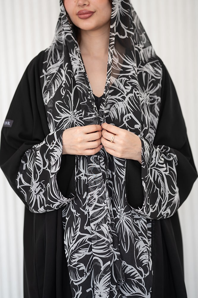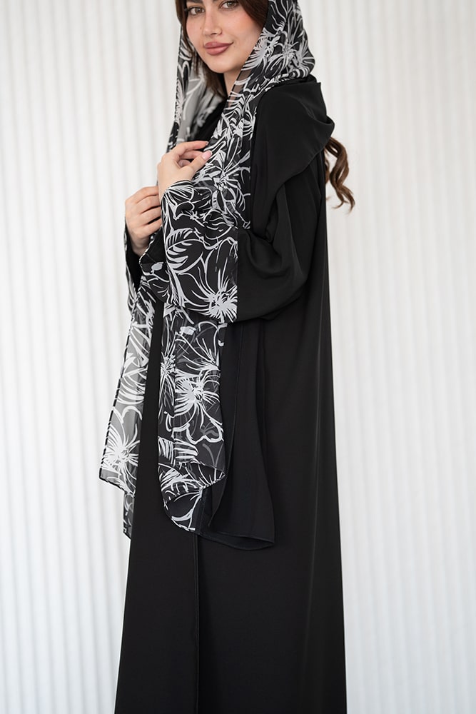 عباية بقماش كريب باللون الأسود مع تركيبة في الأكمام و الطرحه