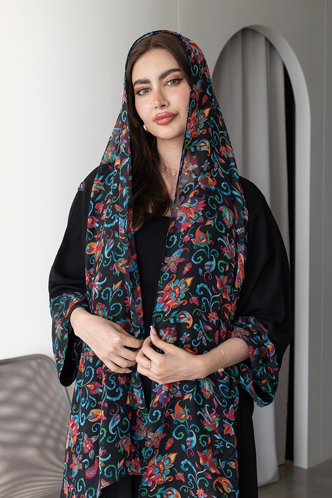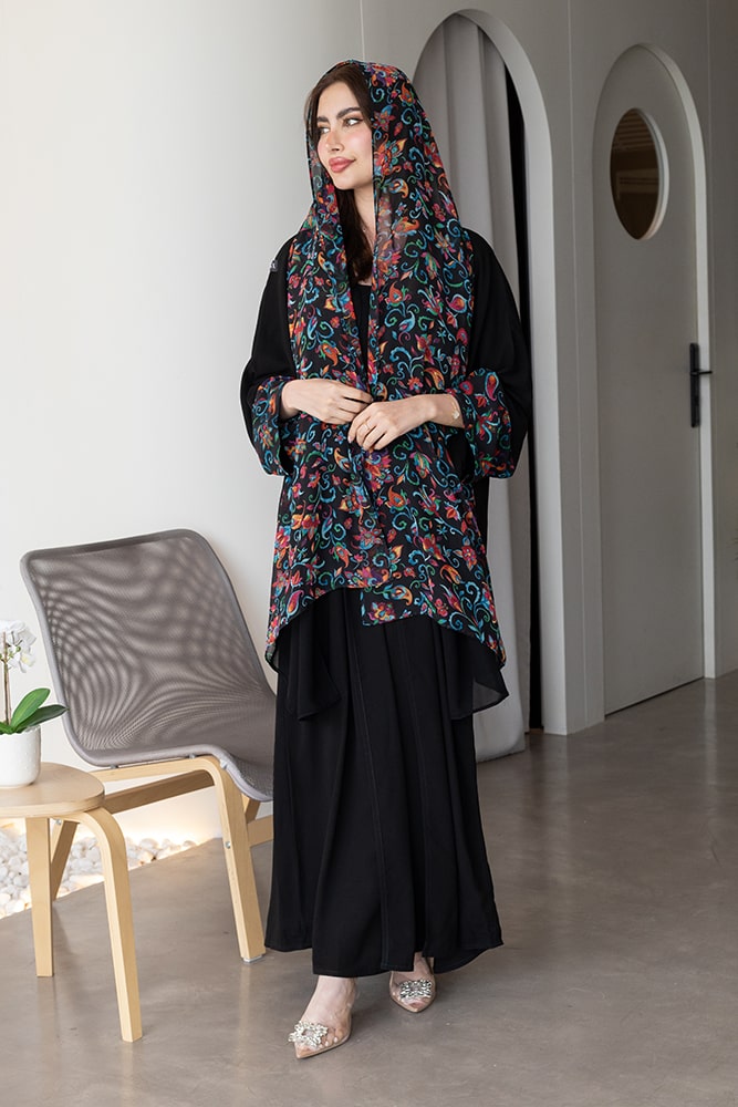 عباية بقماش كريب باللون الأسود مع تركيبة في الأكمام و الطرحه