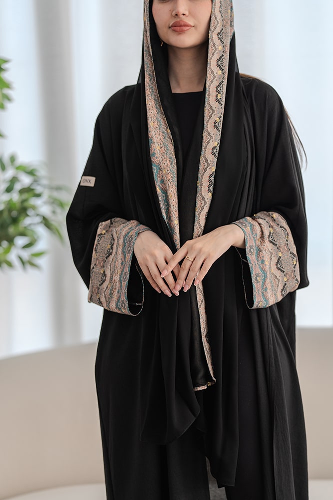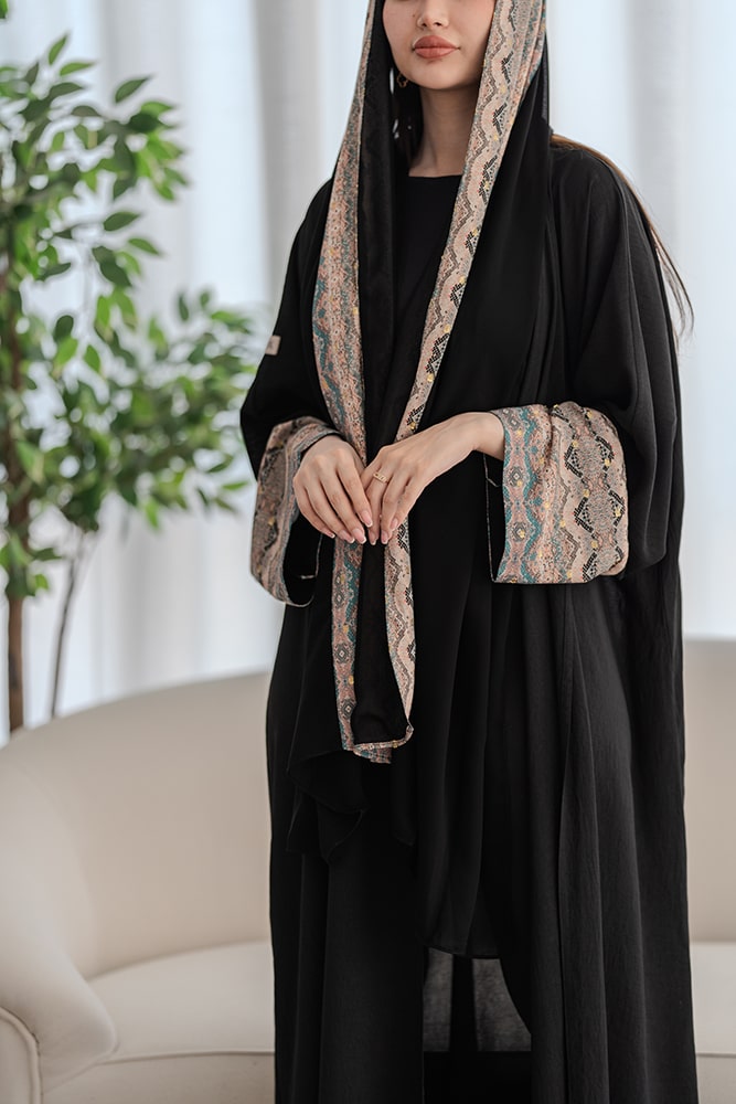 عباية بقماش كريب أسود مع تركيبة في الأكمام و الطرحه