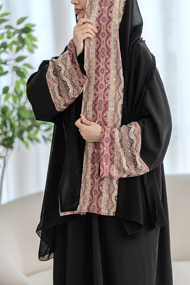 عباية بقماش كريب أسود مع تركيبة في الأكمام و الطرحه