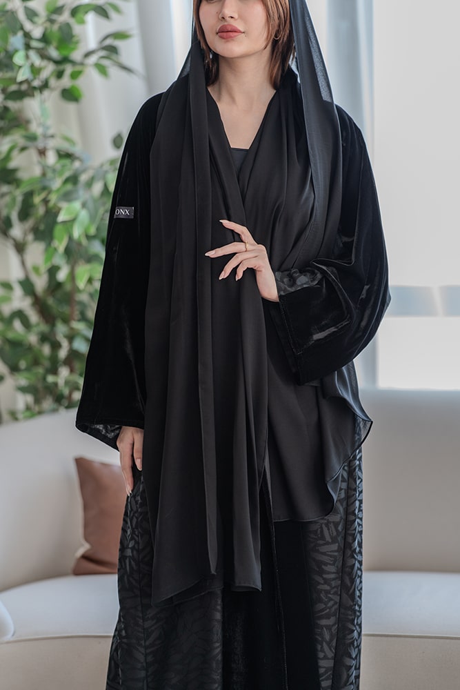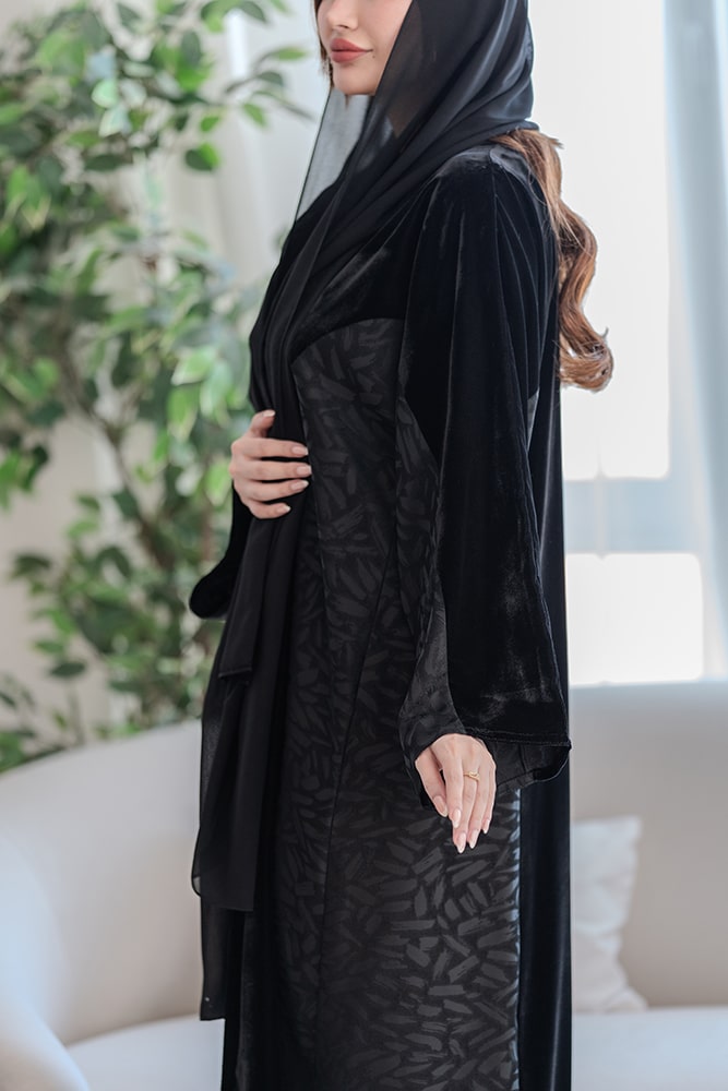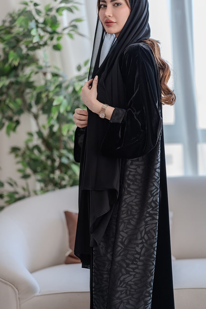 عباية بقماش مخمل أسود مع تركيبة قماش جكار على الجوانب