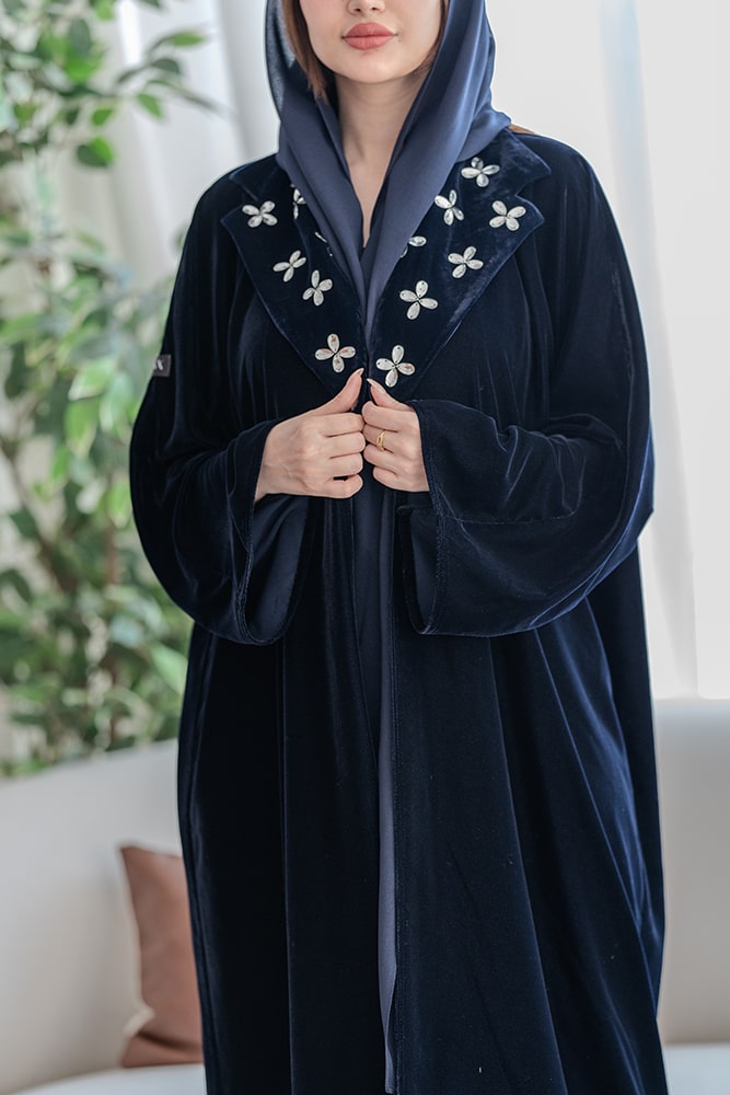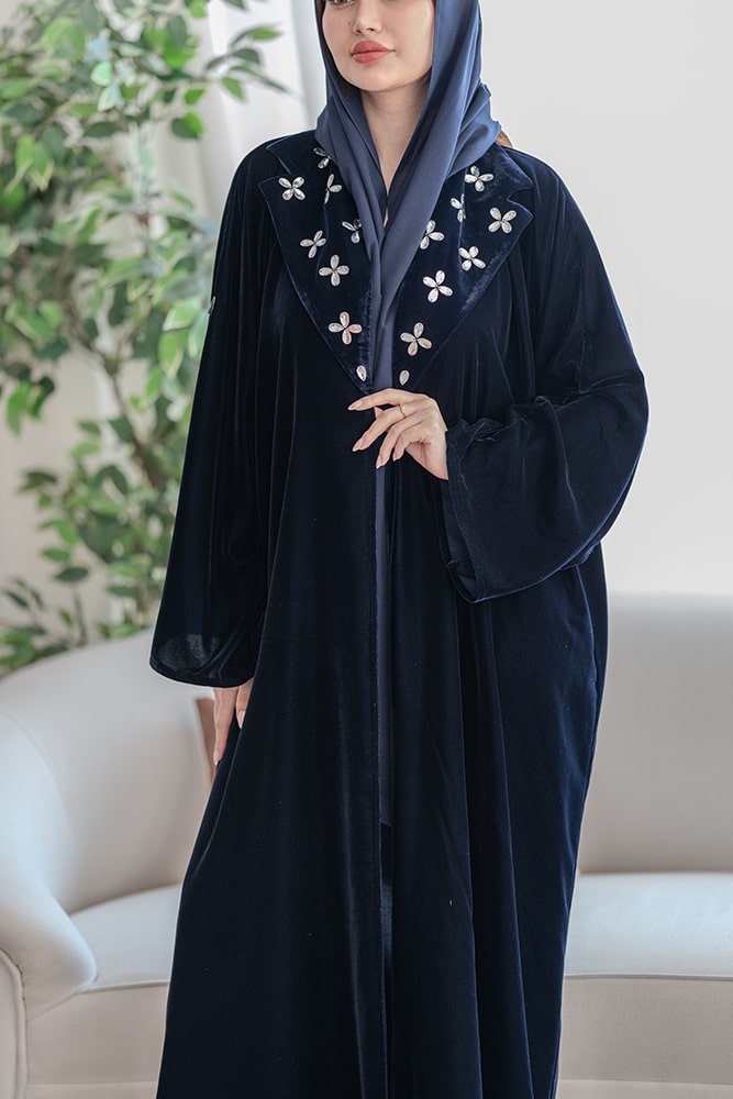 عباية بقماش مخمل كحلي مع شك في الياقه