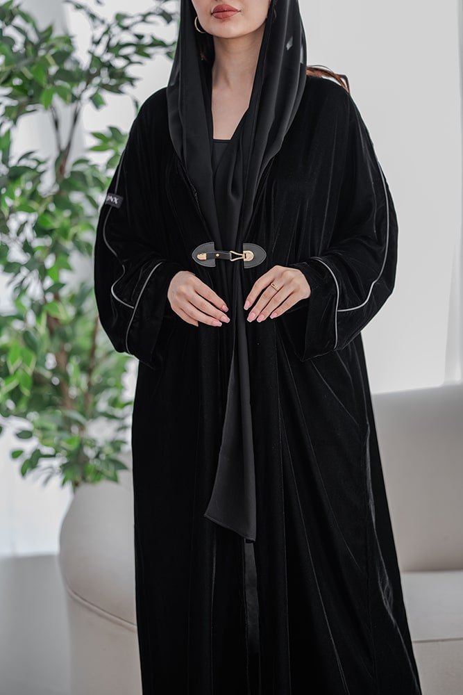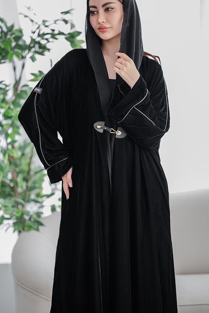 عباية بقماش مخمل أسود مع جلد أسود