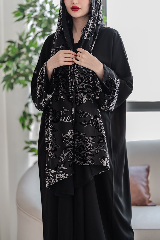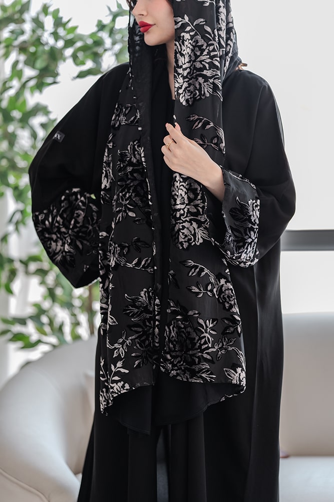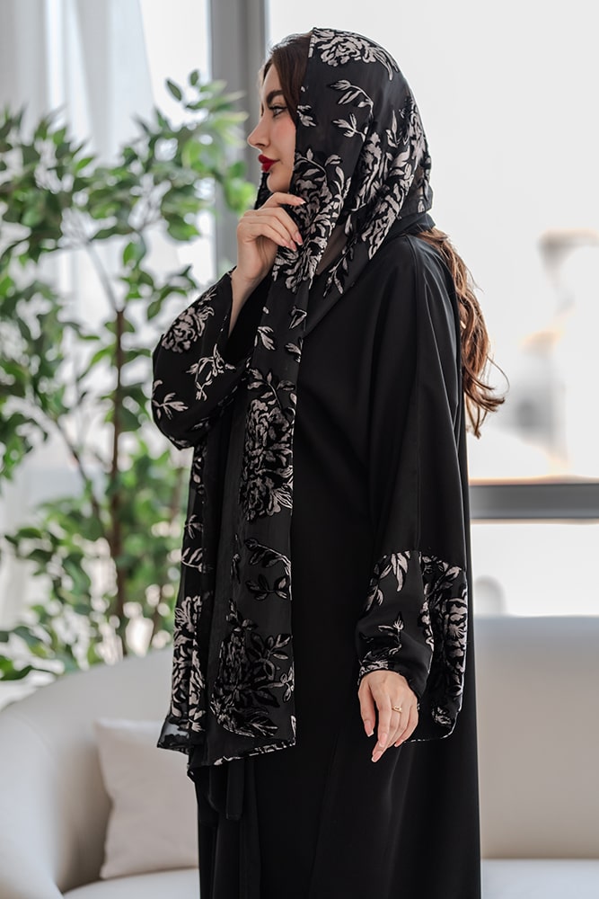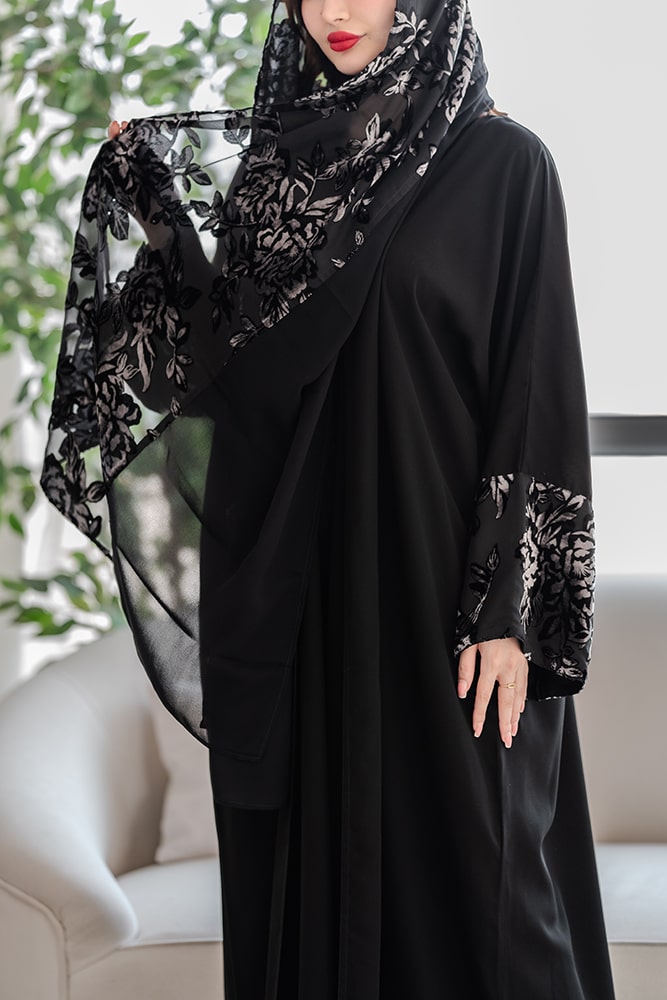 عبايه بقماش كريب أسود مع تركيبة شيفون و مخمل في الأكمام و الطرحه