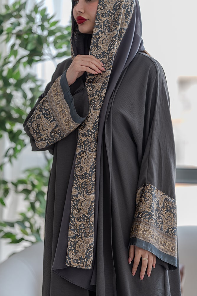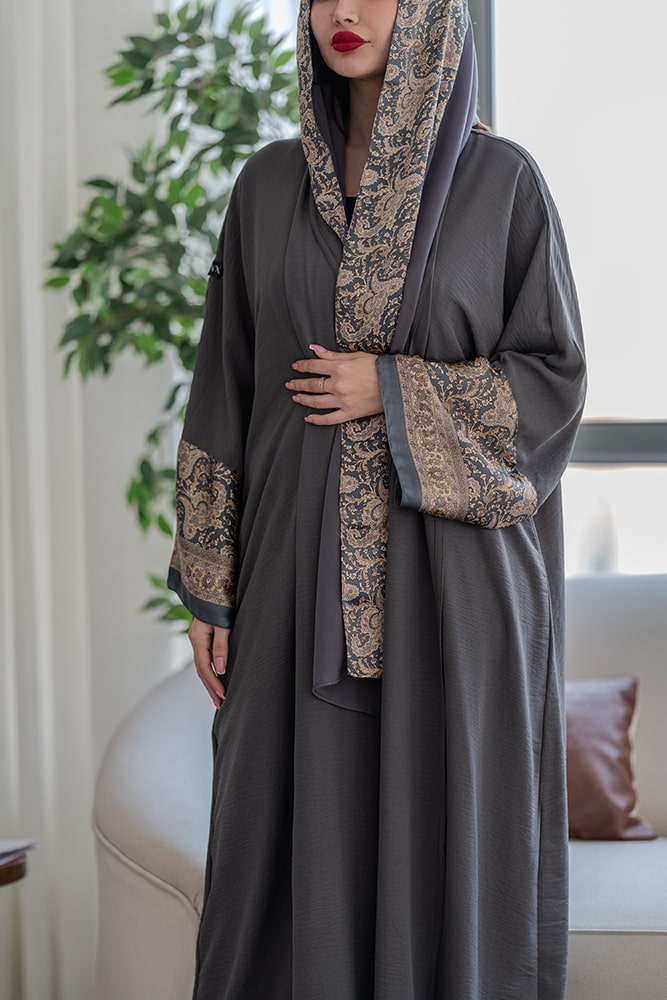 عباية بقماش كريب رصاصي مع تركيبة حرير في الأكمام و الطرحه