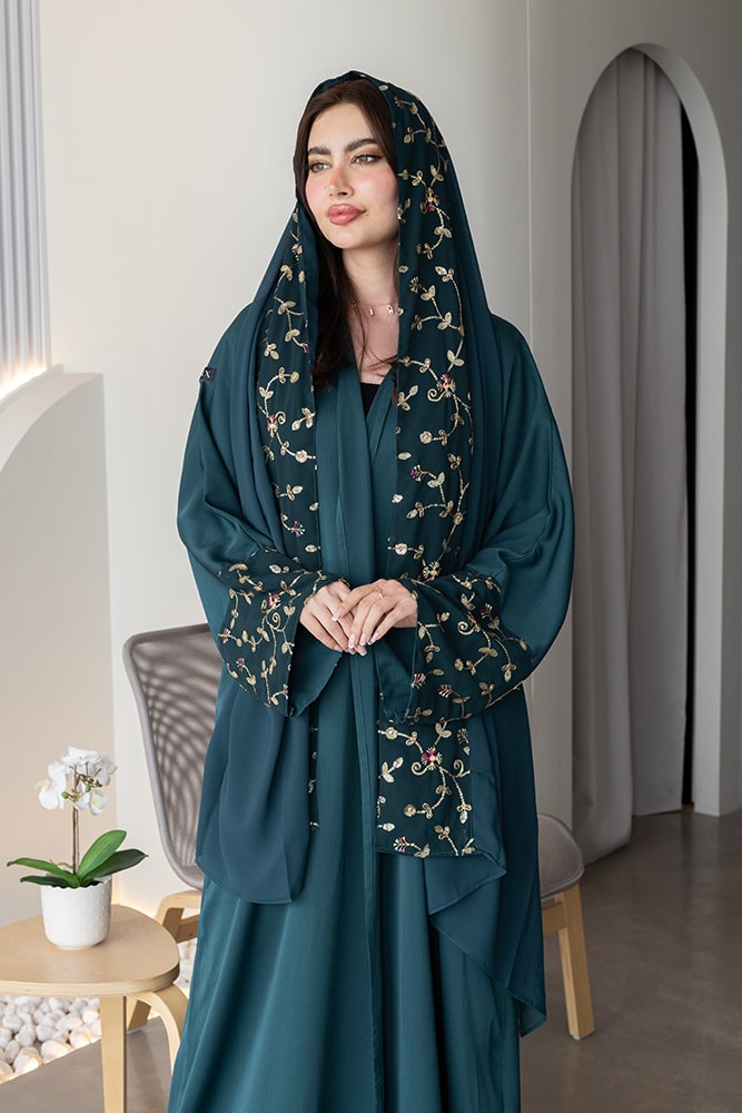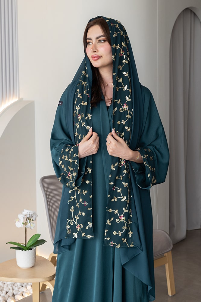 عباية بقماش كريب أخضر داكن مع تطريز وشك باللون الذهبي