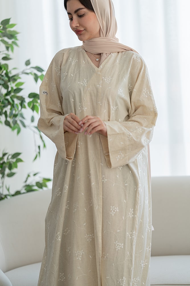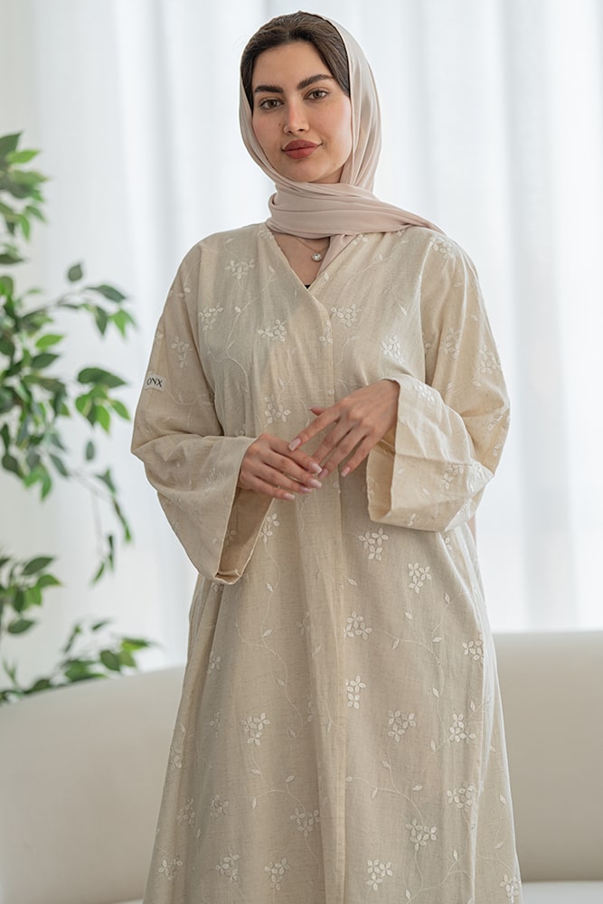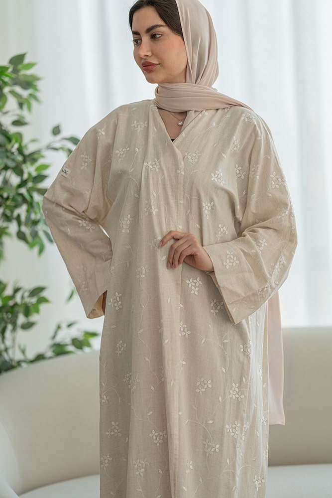 عباية بقماش لينين بيج مع تطريز أبيض مع الطرحه