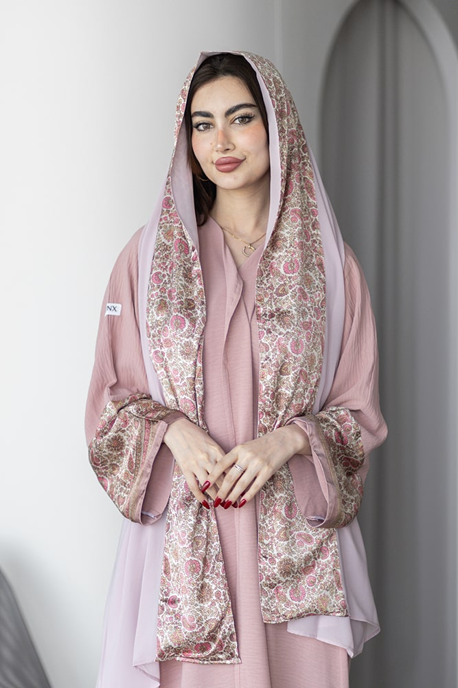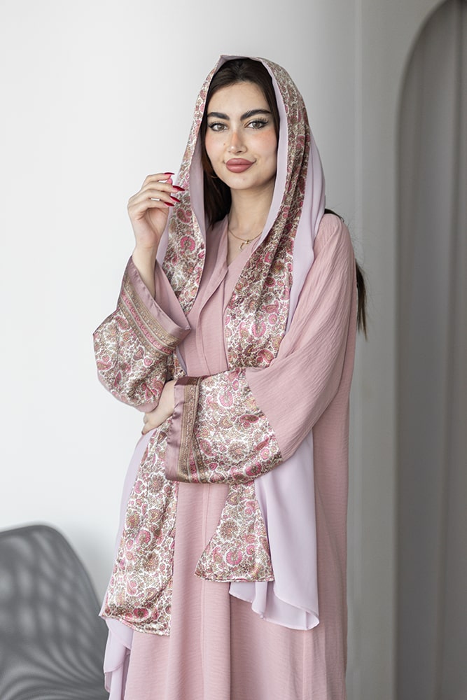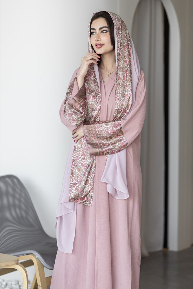 عباية بقماش كريب وردي مع تركيبة حرير في الأكمام و الطرحه