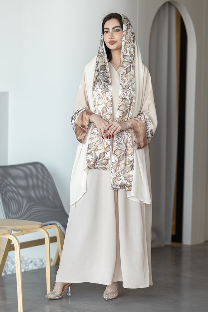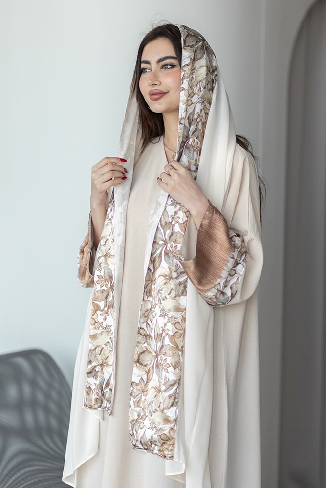 عباية بقماش كريب بيج مع تركيبة حرير في الأكمام و الطرحه