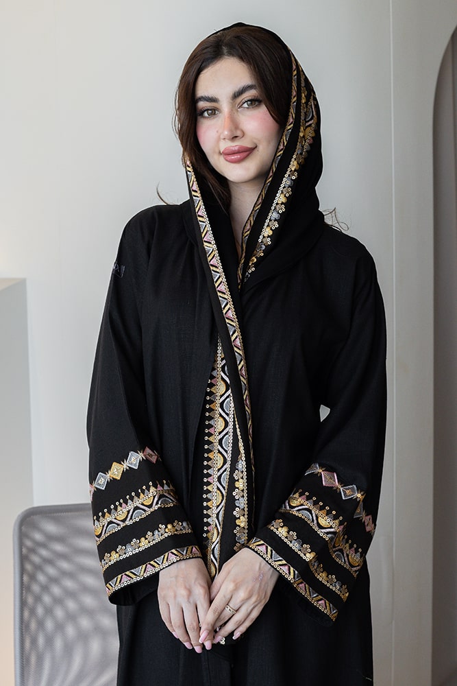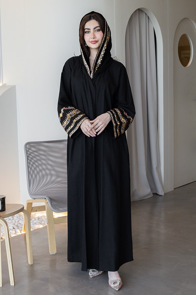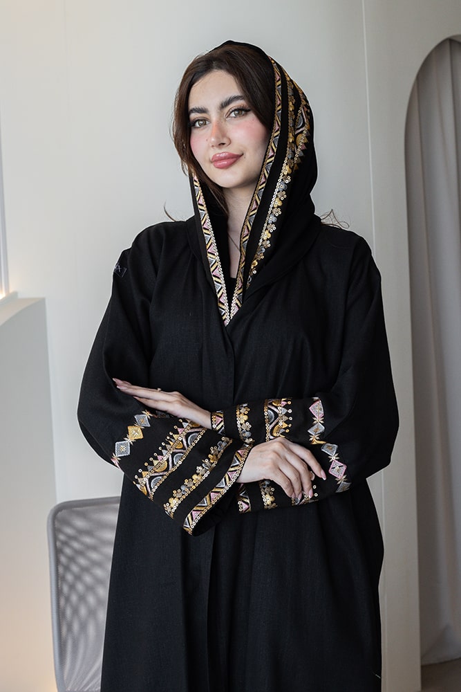 عباية بقماش لينين أسود مع تطريز في الأكمام و الطرحه