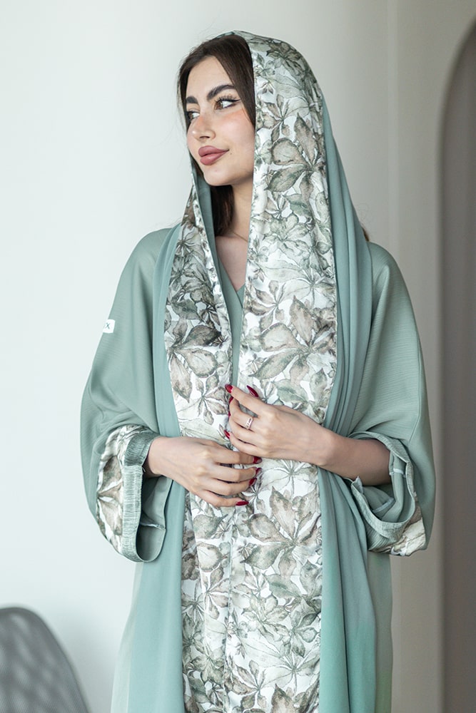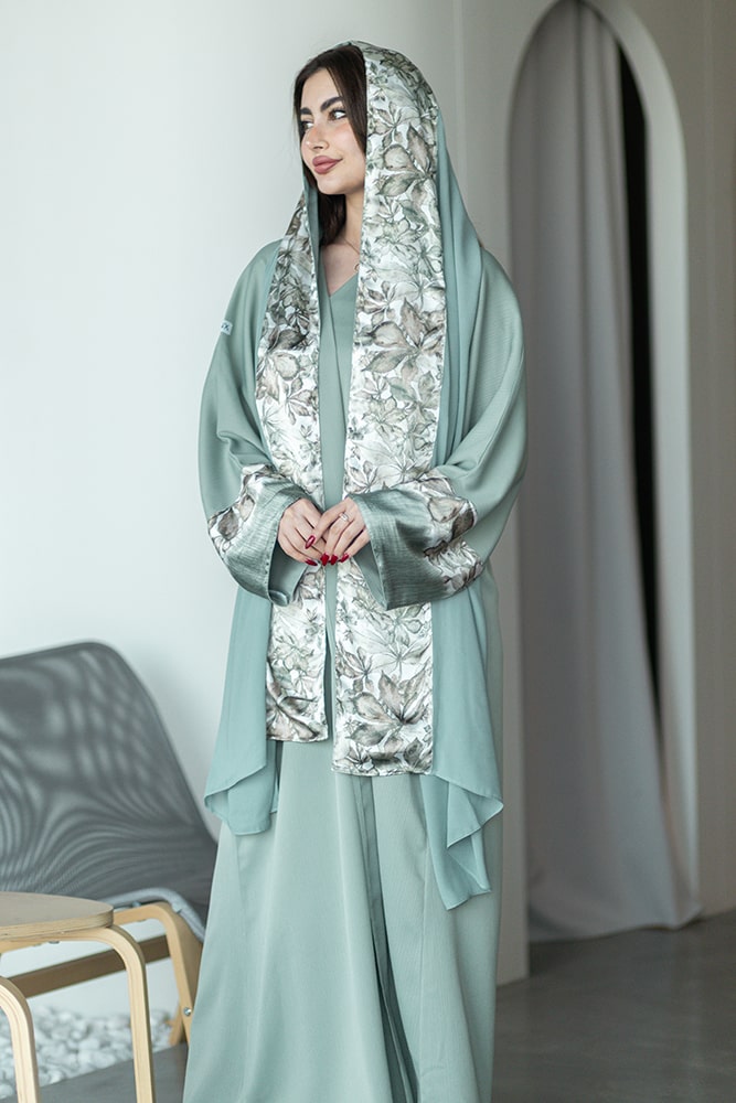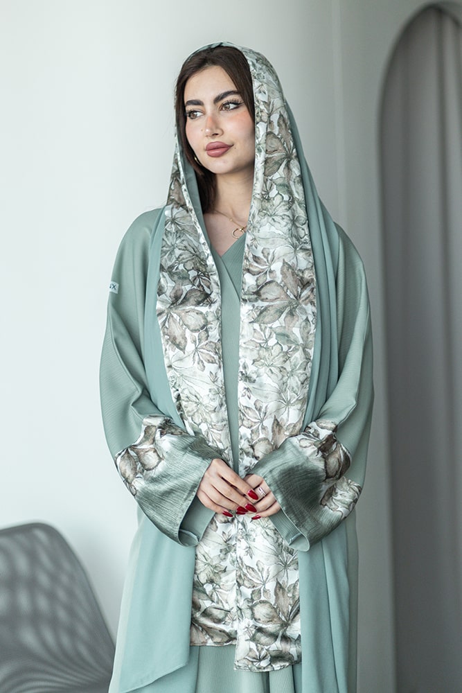 عباية بقماش كريب أخضر مع تركيبة حرير في الأكمام و الطرحه