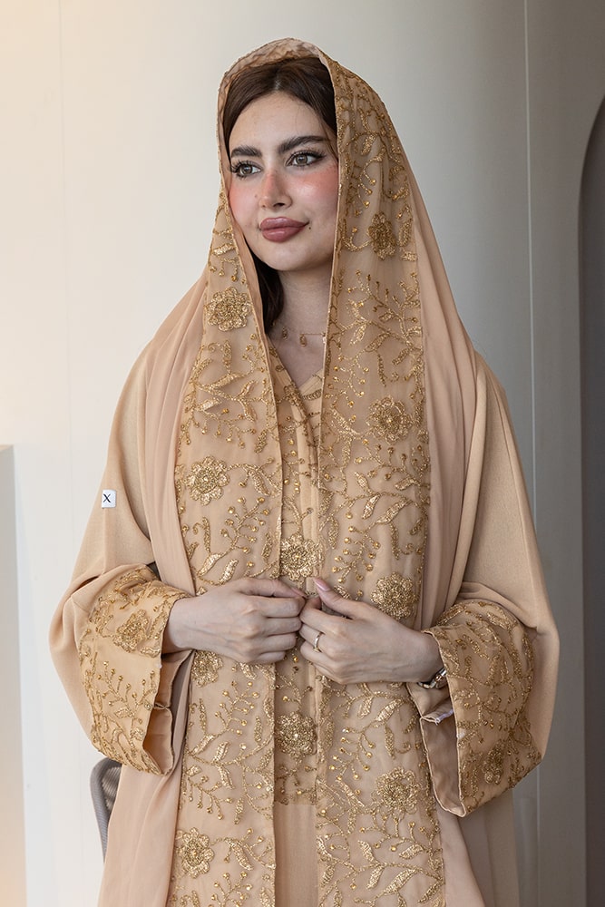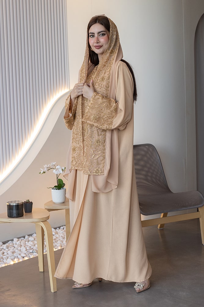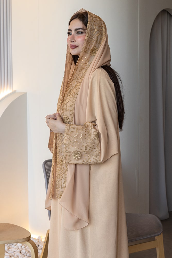 عباية بقماش كريب بيج مع تطريز باللون الذهبي