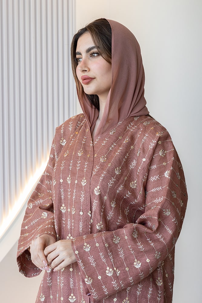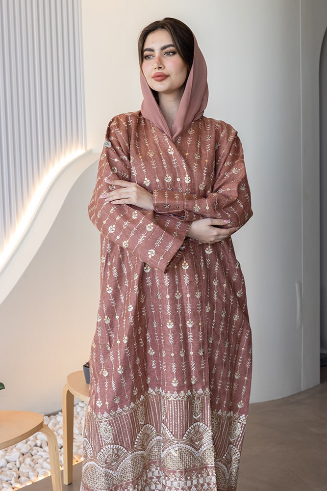عباية بقماش لينين مطرزه باللون الذهبي مع الطرحه
