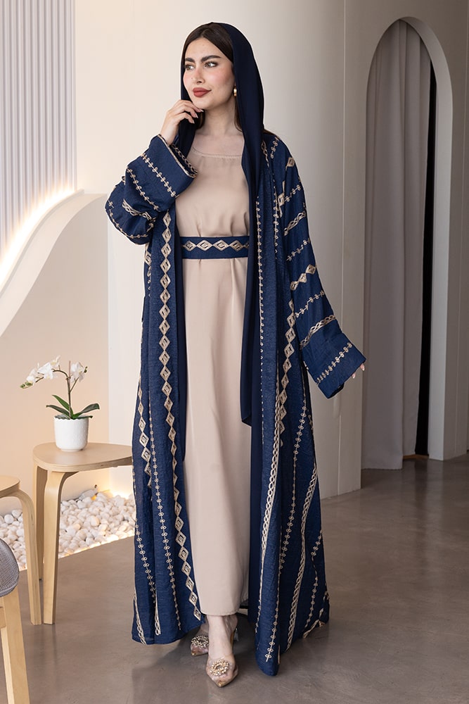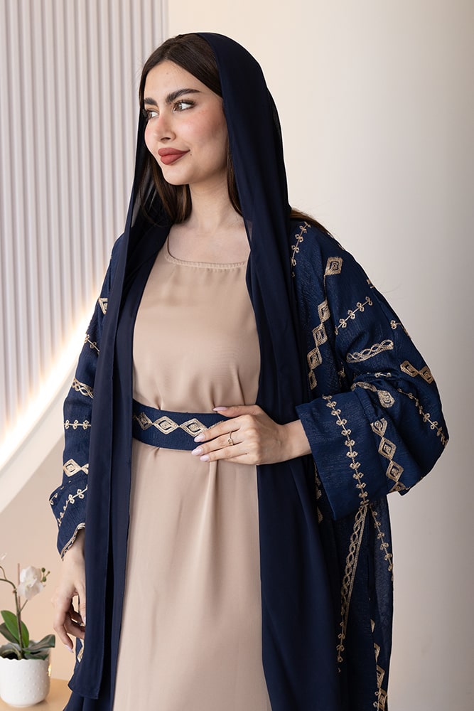 عباية بقماش كريب مع تطريز ذهبي وحزام
