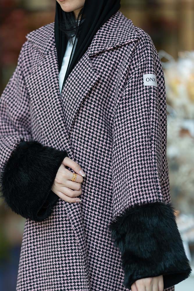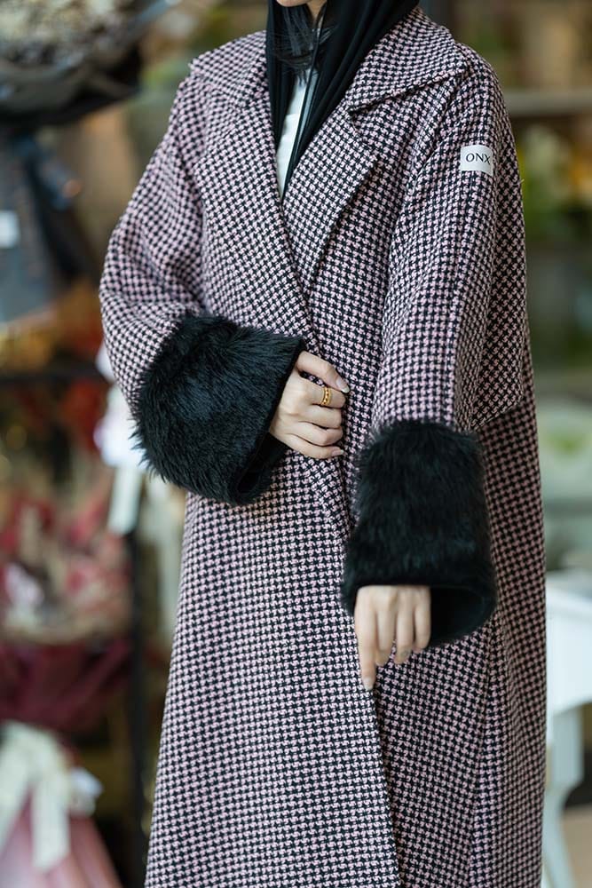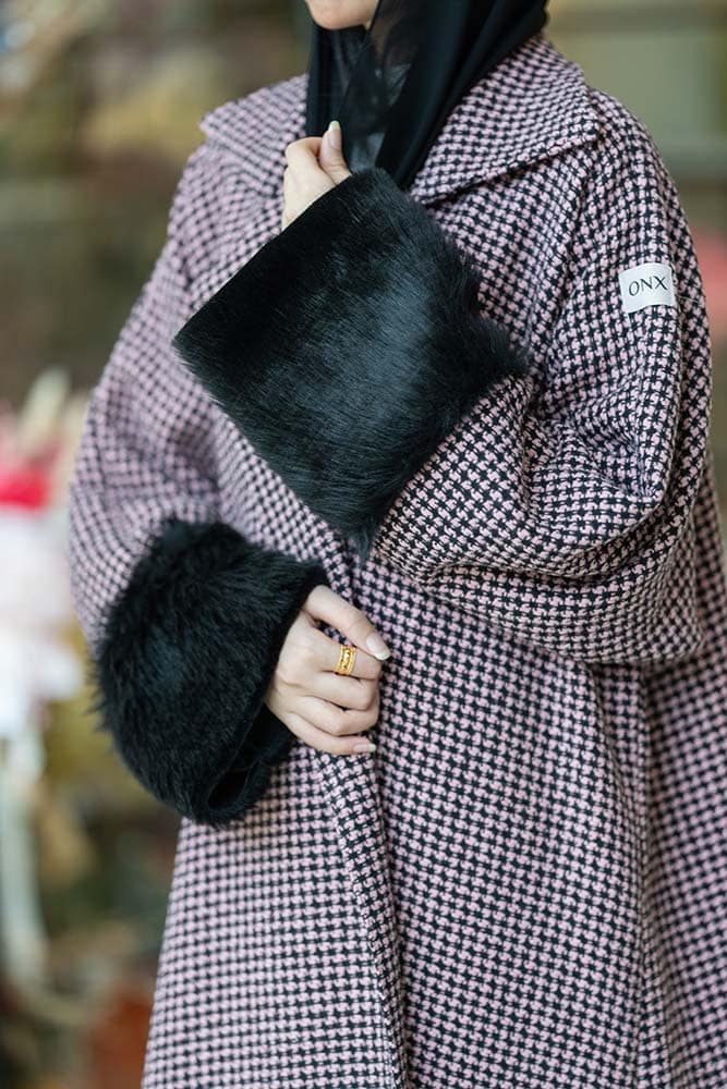 عبايه شتويه صوف و فرو باللون الوردي والأسود