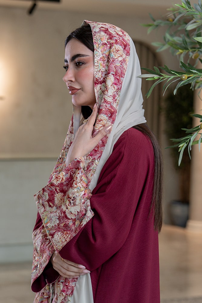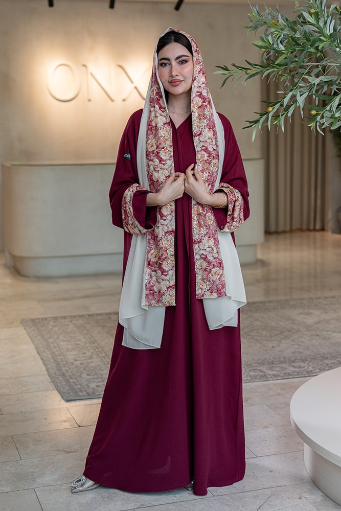 عباية بقماش كريب ماروني مع تركيبة في الأكمام و الطرحه