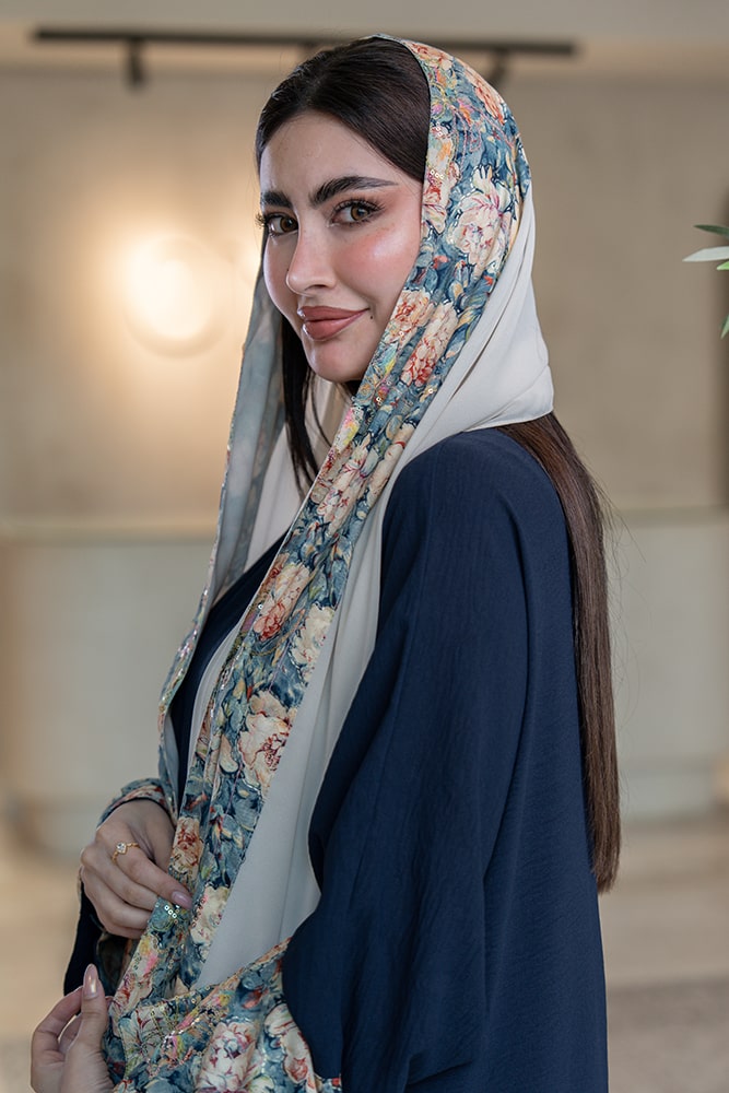 عباية بقماش كريب كحلي مع تركيبة في الأكمام و الطرحه