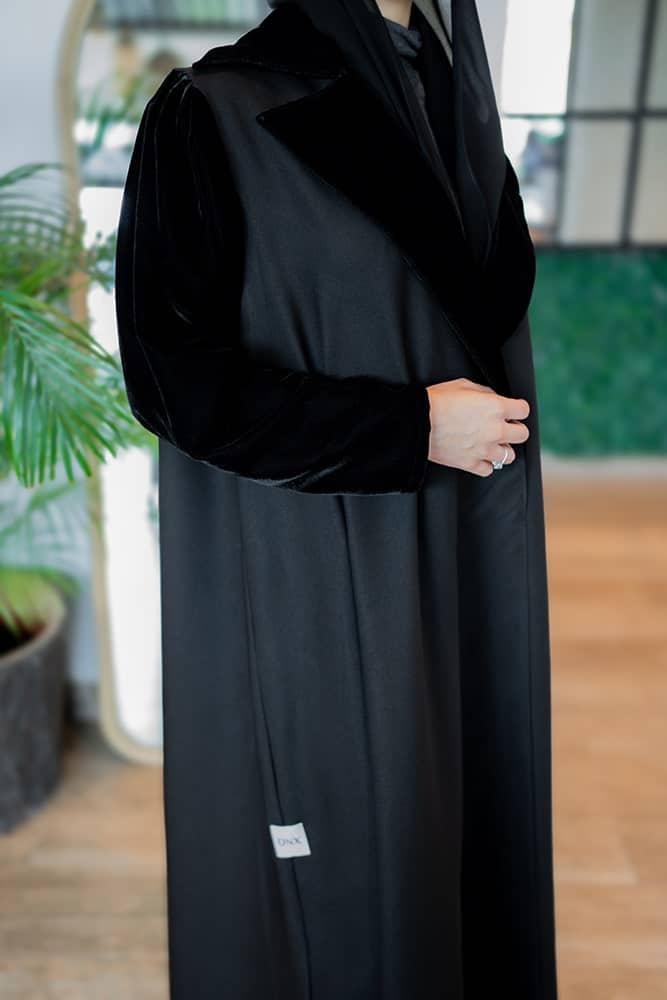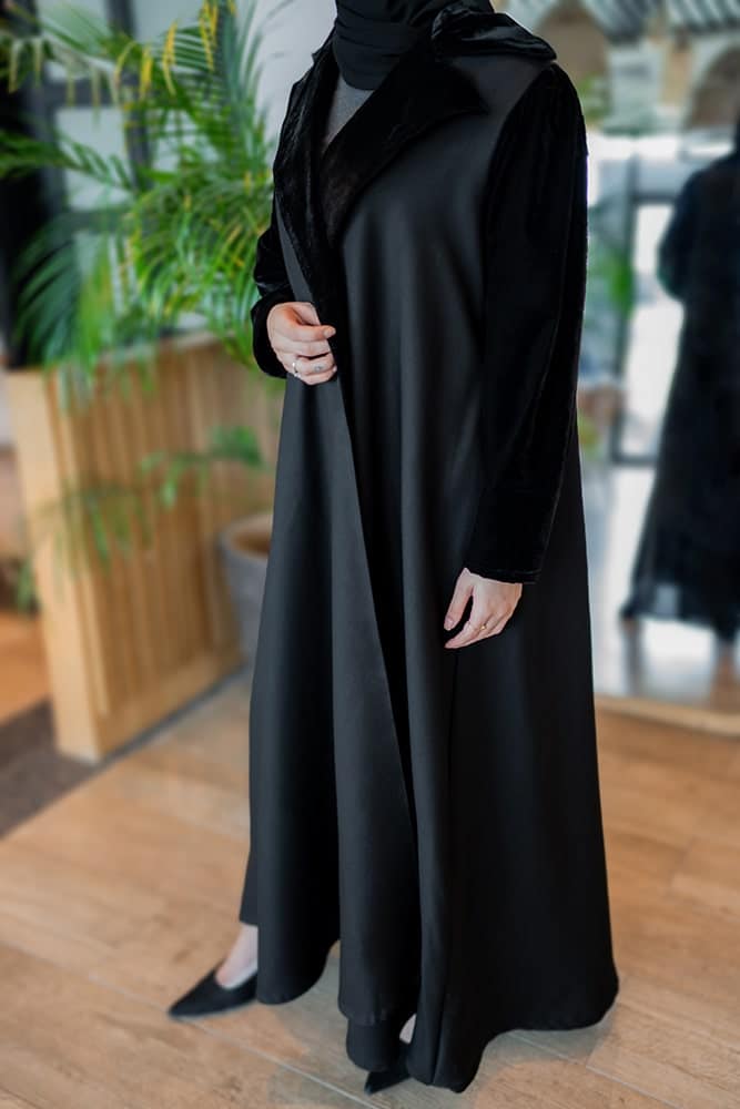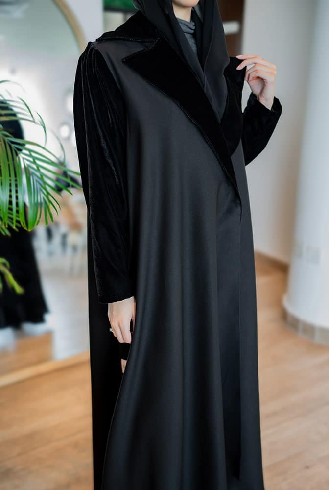 عباية بقماش كريب اسود كلوش مع زم خفيف في الاكمام
