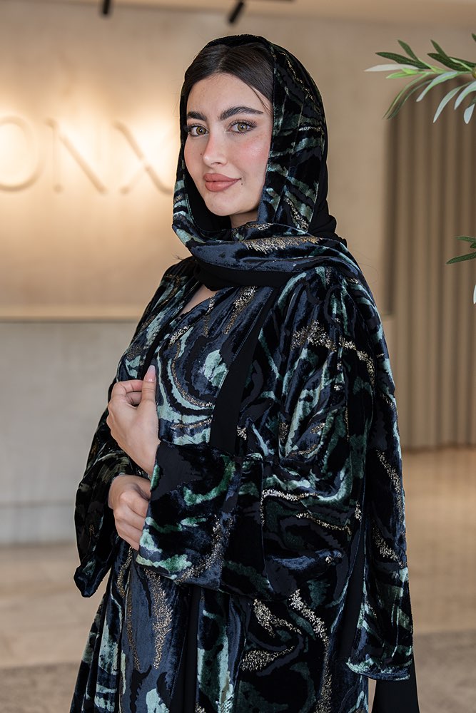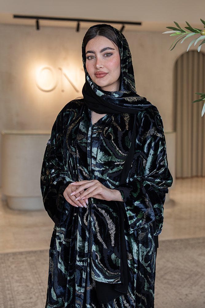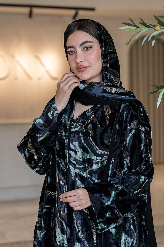 عباية شتوية بقماش مخمل باللون الأسود والذهبي و الأخضر