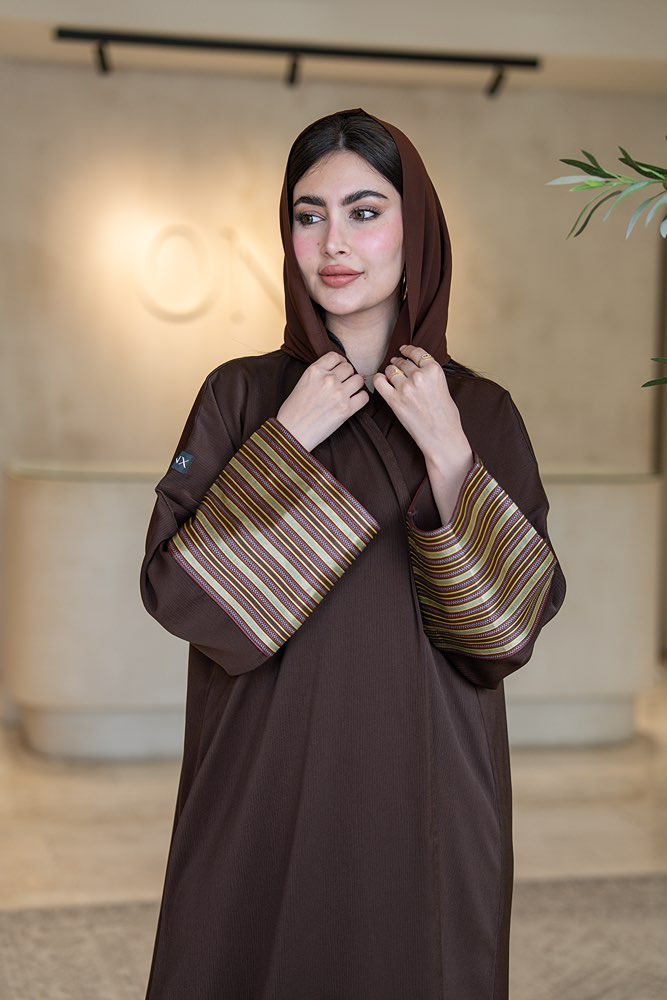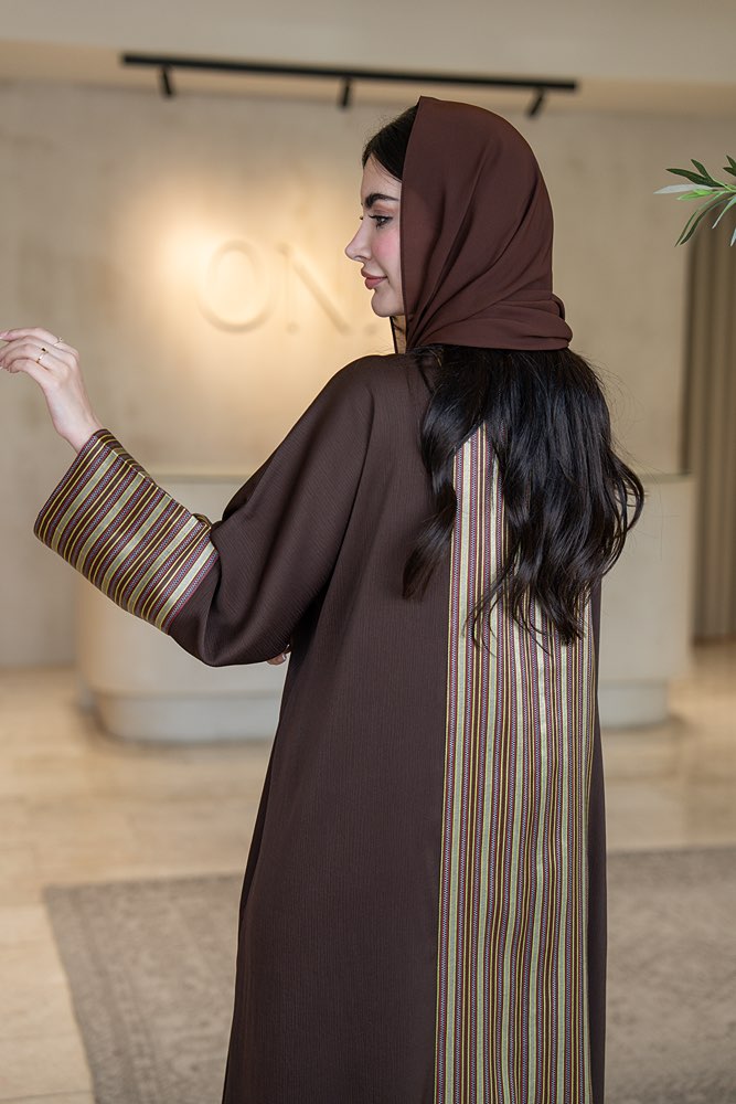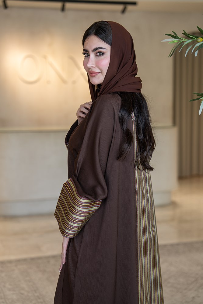 عباية بقماش كريب بني مع تركيبة في الأكمام و الخلف