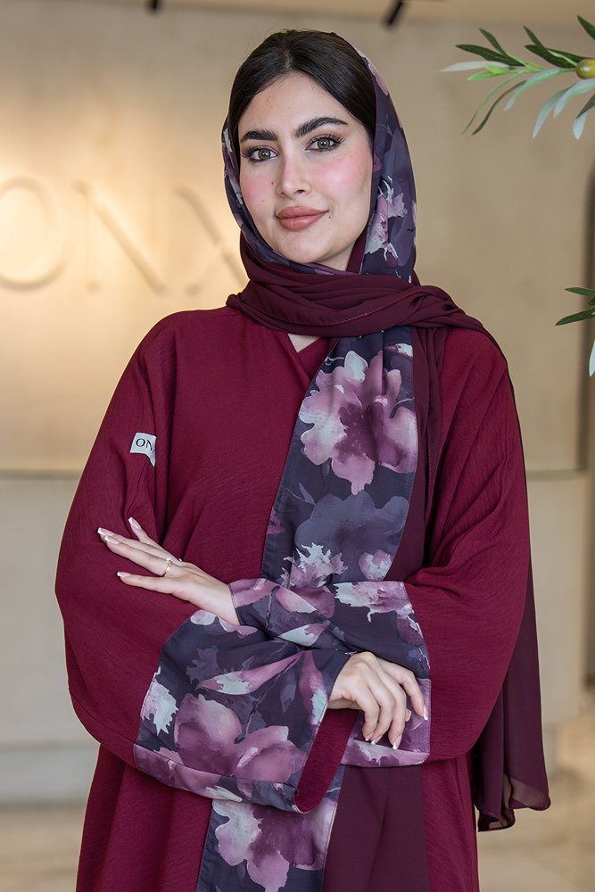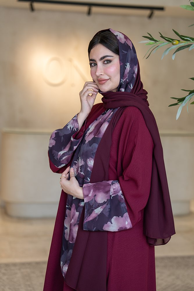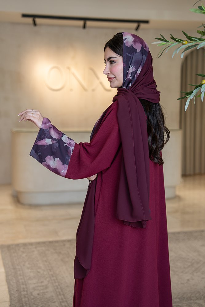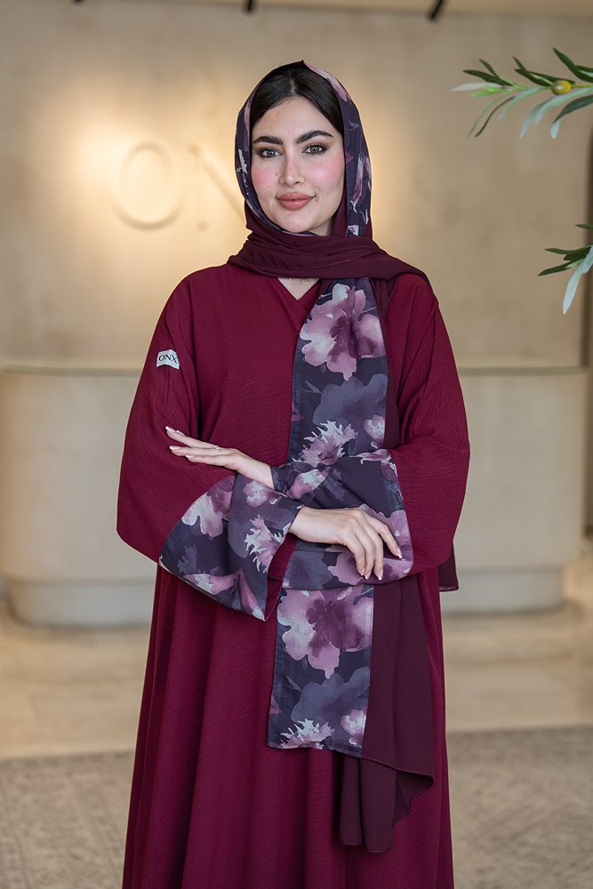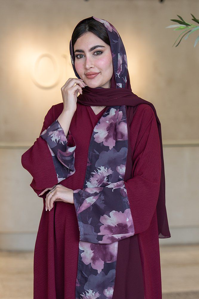 عباية بقماش كريب ماروني مع تركيبة في الأكمام و الطرحه