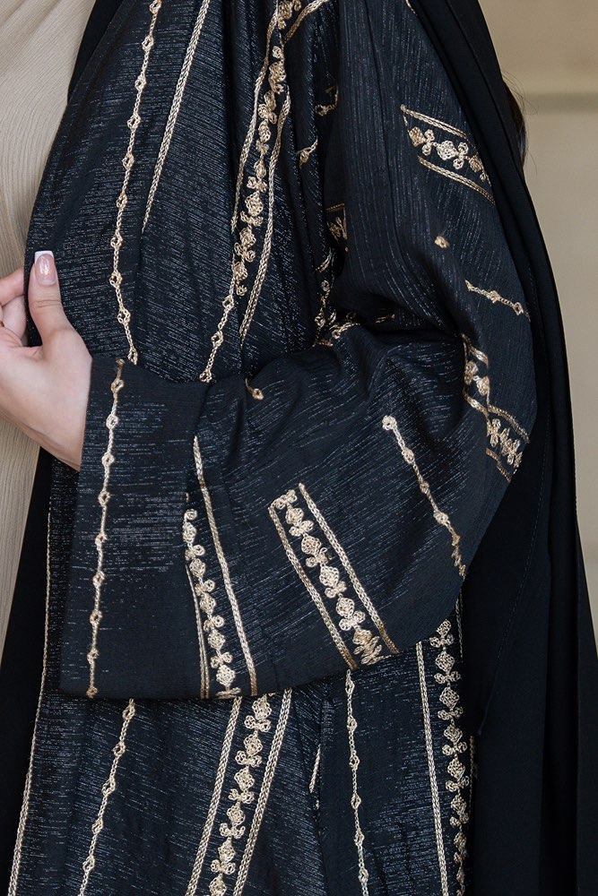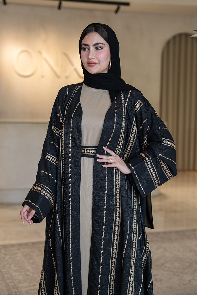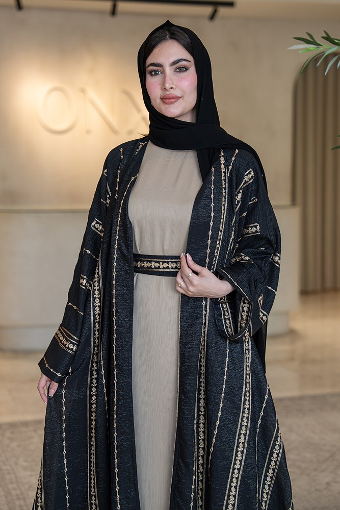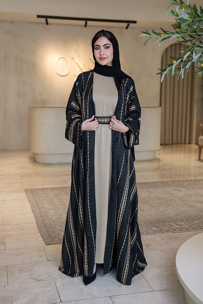 عباية باللون الأسود مع تطريز ذهبي مع الحزام الداخلي والفستان أختياري