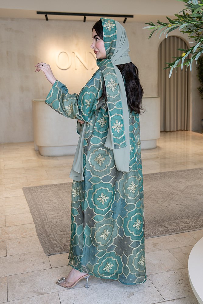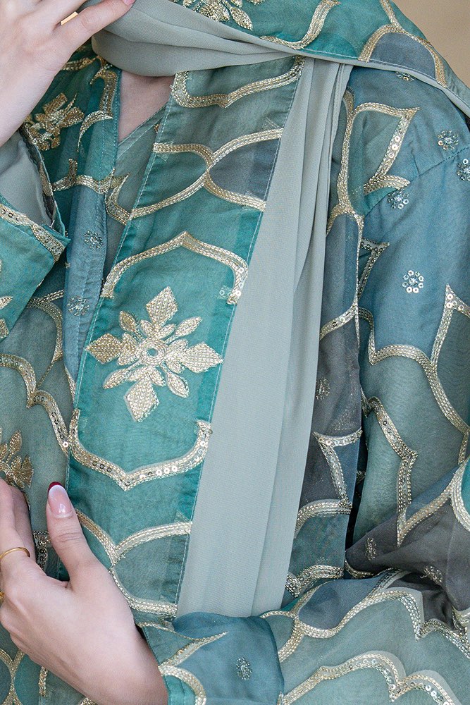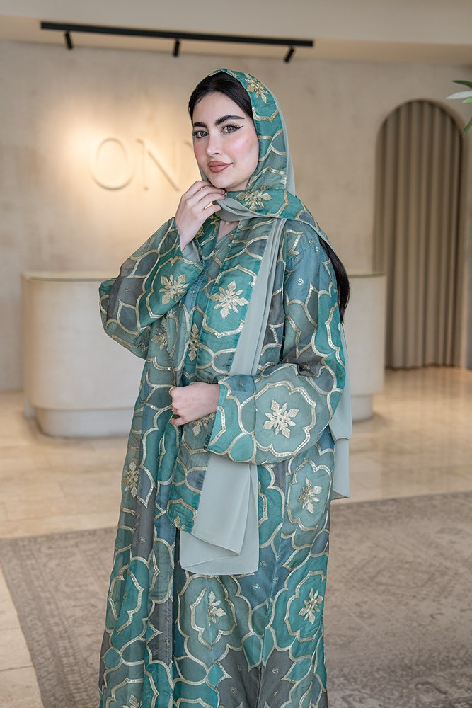 عباية بقماش أورنجنزا مطرزه باللون الذهبي مع الطرحه