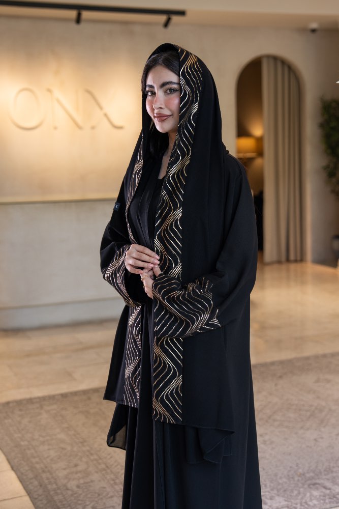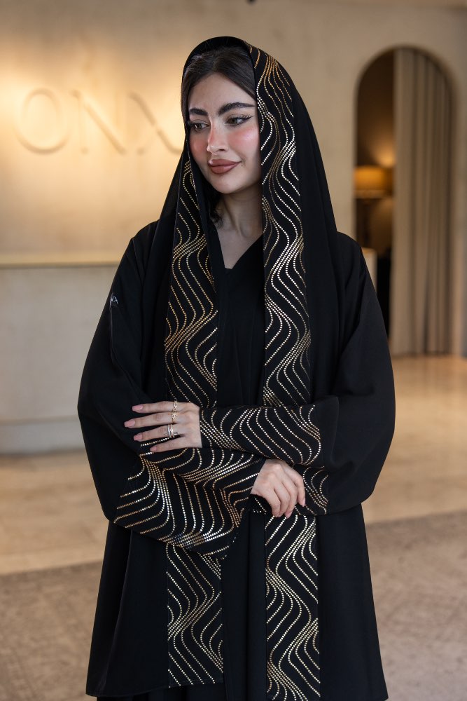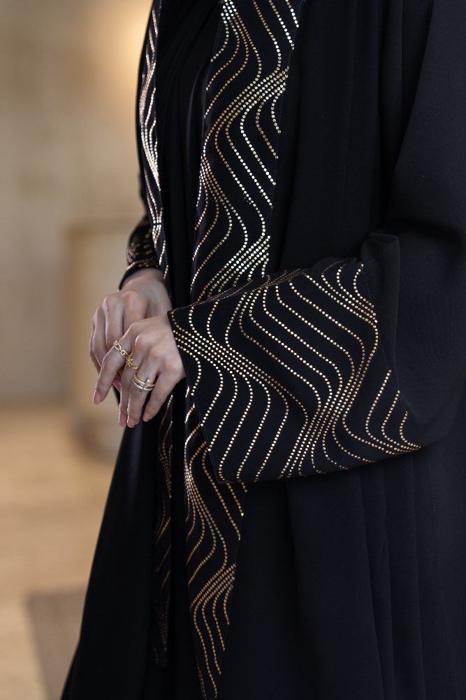 عباية بقماش كريب أسود مع تركيبة باللون الذهبي في الأكمام و الطرحه