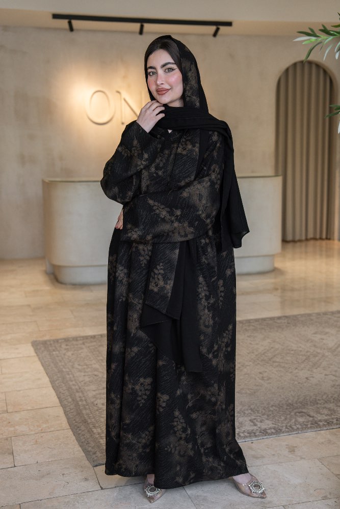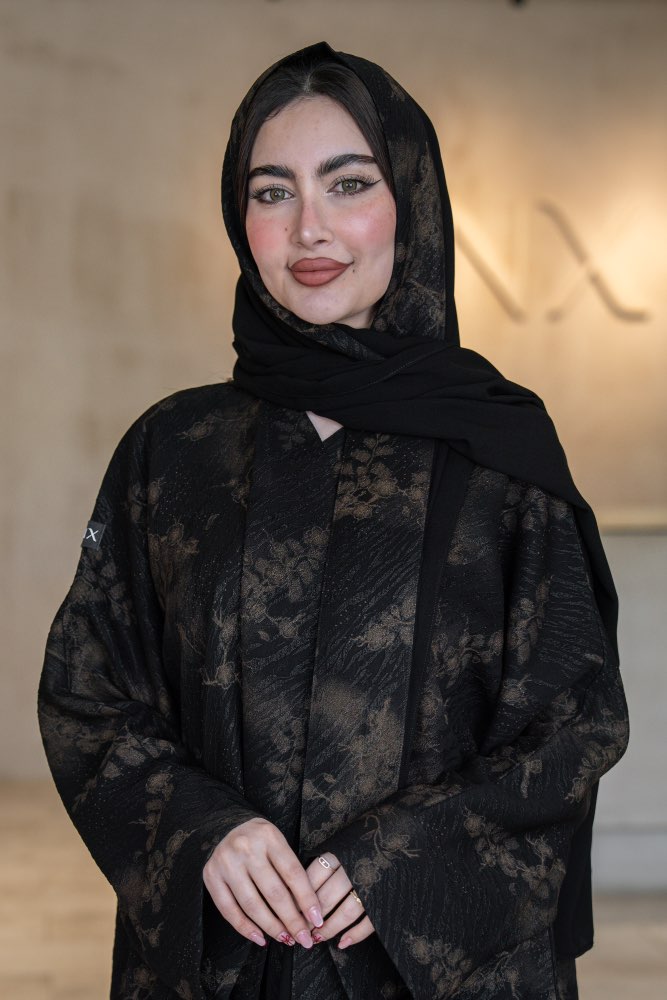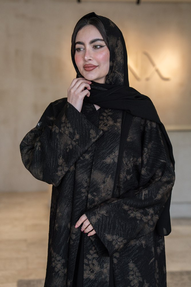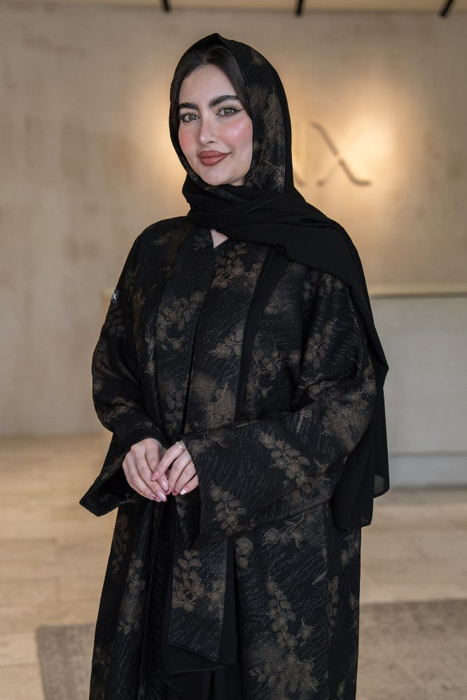 عباية باللون الأسود من قماش جاكار فاخر تحمل نقشات زهرية ذهبية منسجمة تمنحها حضوراً راقياً في كل مناسبة، قطعة تجمع بين الفخامة الهادئة والأناقة التي تلفت الأنظار