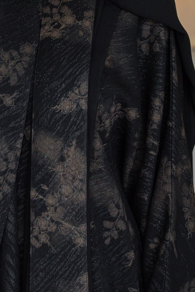 قماش جاكار ذو ملمس مميز يحمل نقشات زهرية ذهبية ضخمة منتشرة على خلفية سوداء غامقة، اللمعة الخفيفة في الخيوط الذهبية تضيف بريقاً دافئاً وراقياً يظهر في كل إضاءة، حافات أمامية بخط أسود أنيق يكمل شكل العباية بدقة