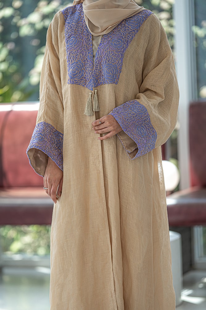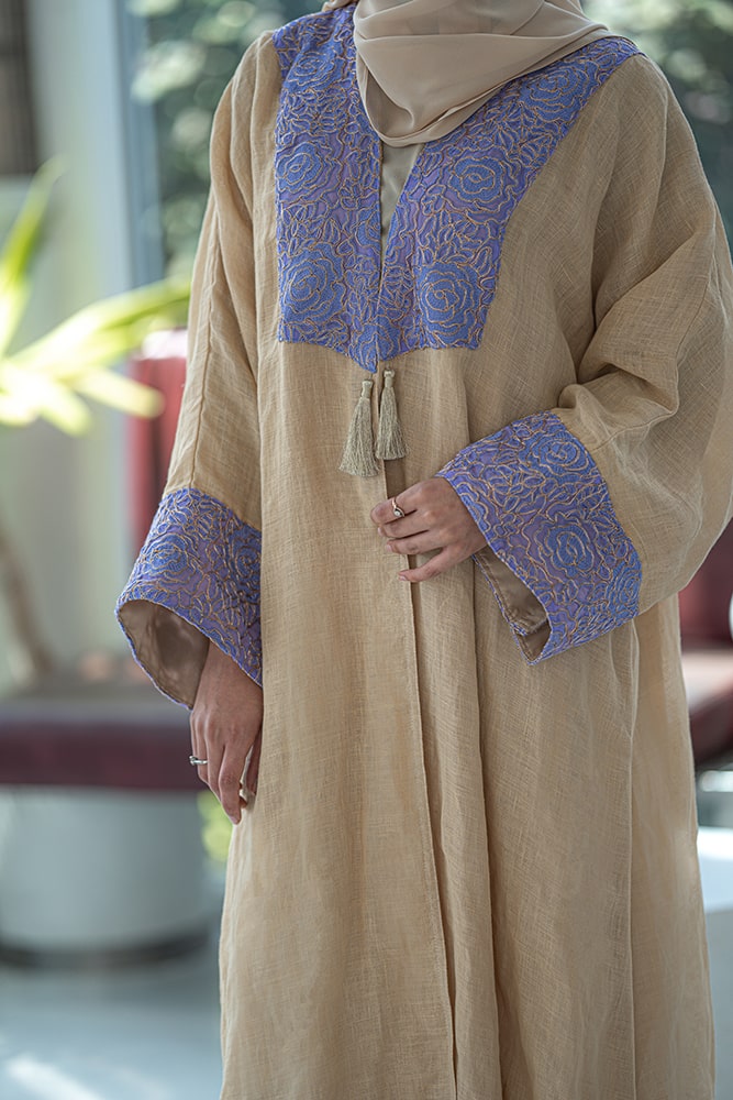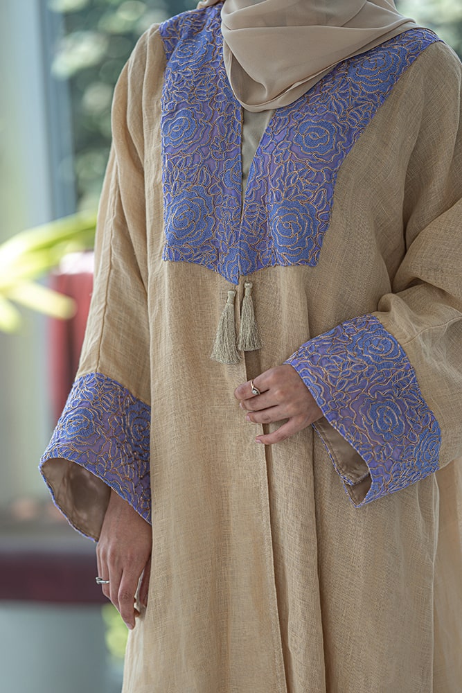عبايه ذهبيه بتركيبه باللون الافندر على الياقه و الاكمام